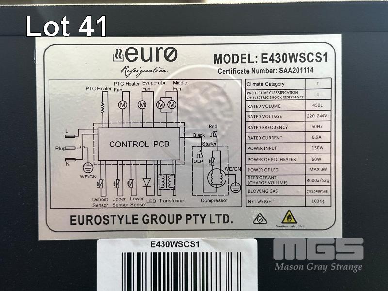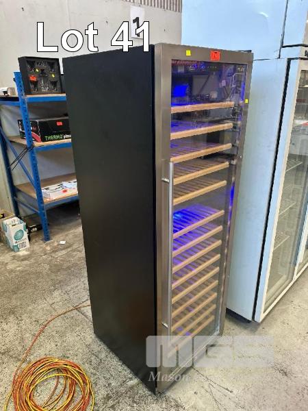 WINE COOLER FRIDGE, EURO MOD: E430WSCS1 UP TO 160 WINE BOTTLE CAPACITY, 450 LITRE FACTORY PRESET TEMPERATURE CHART UPPER: 5 DEGREE CELSIUS, LOWER: 12 DEGREE CELSIUS LCD LIGHT DISPLAY 240V, 10 AMP 2 x KEYS IN OFFICE WITH BOOK