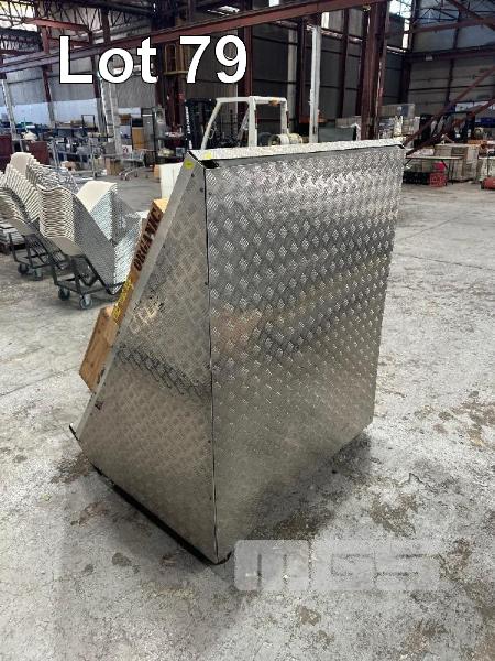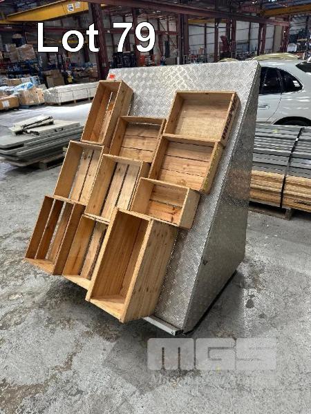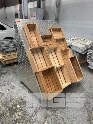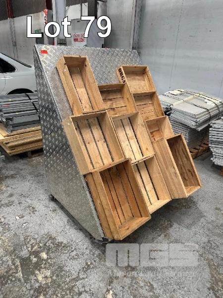 CHECKER PLATE FRUIT & VEG DISPLAY WITH 10 x TIMBER CRATES,