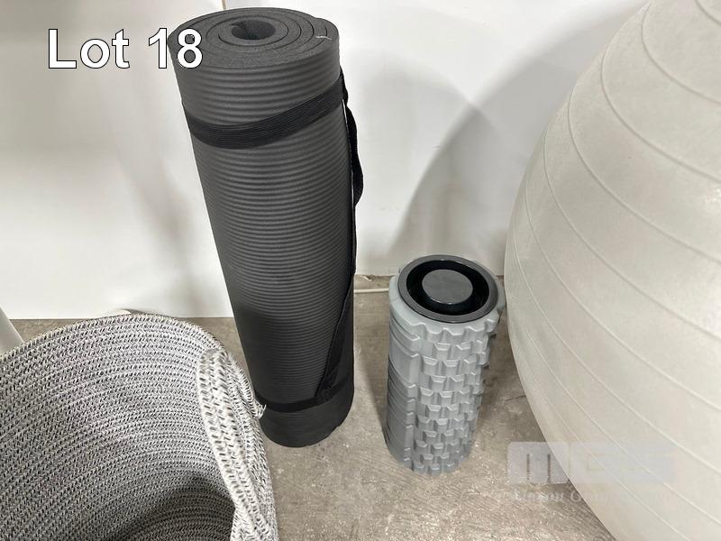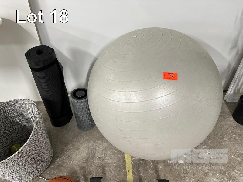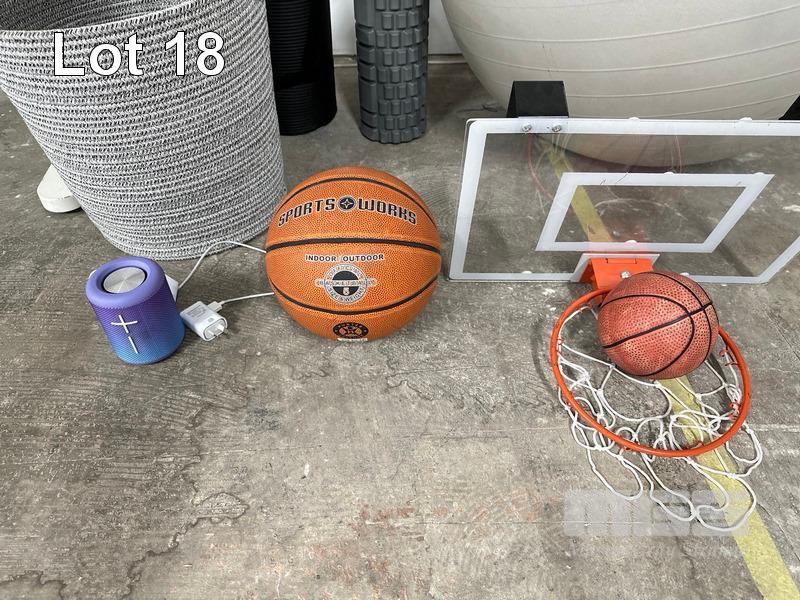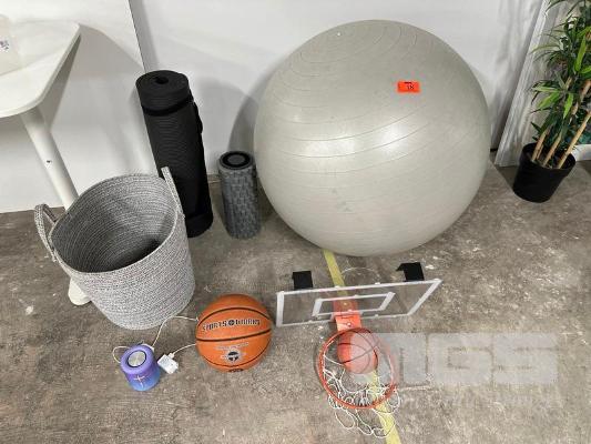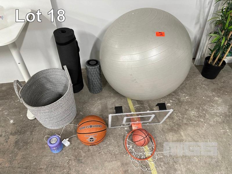 EXCERCISE BALL, YOGA MAT, MASSAGE FOAM ROLLER, BLUETOOTH SPEAKER, BASKETBALL & MINI BASKETBALL HOOP