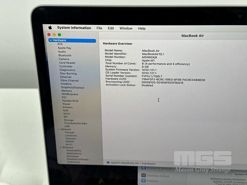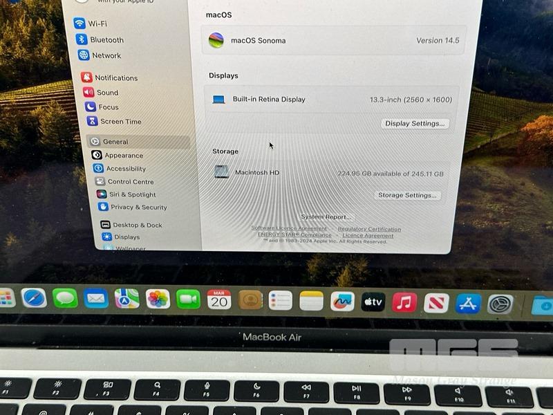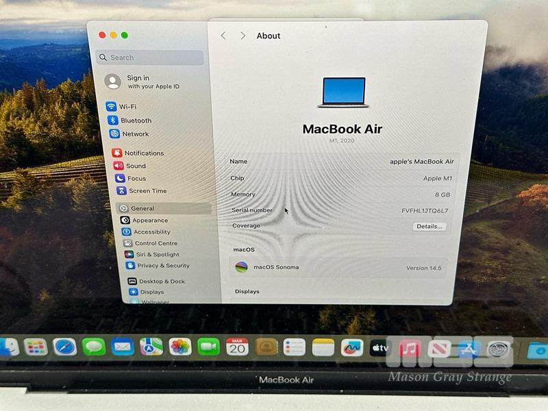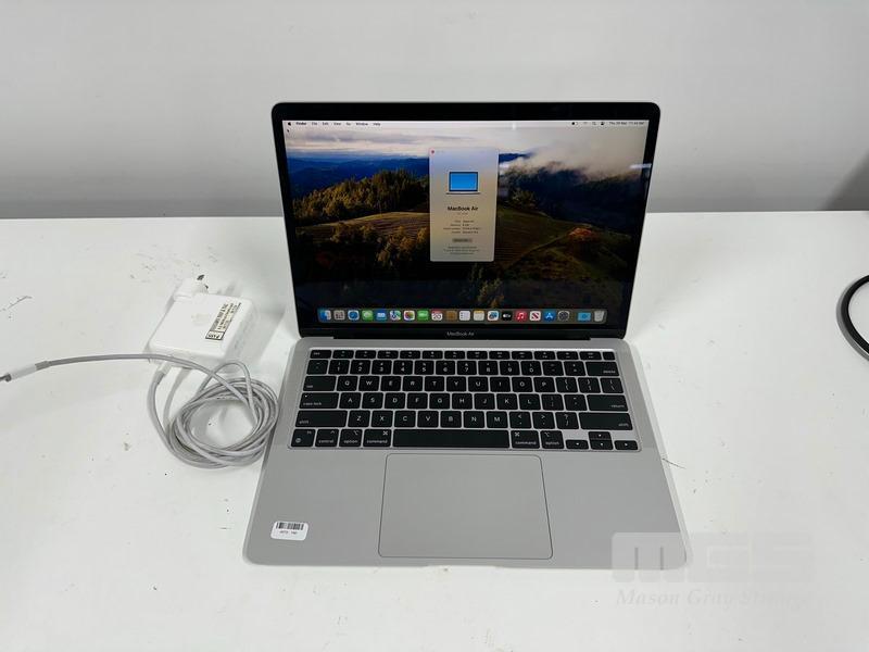 LAPTOP, APPLE MACBOOK AIR (A2337), MGN93X/A, APPLE M1 8 CPU/7 GPU, 8GB RAM, 256GB SSD, 13.3" RETINA DISPLAY, MAC OS 14 INSTALLED & POWER SUPPLY (NOTE: 1 x USB-C PORT FAULTY)