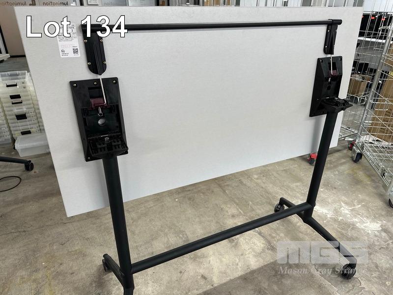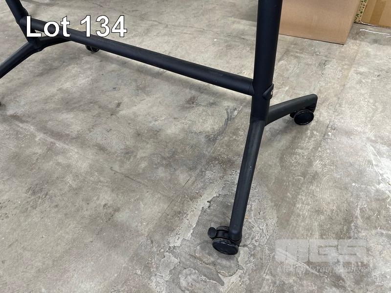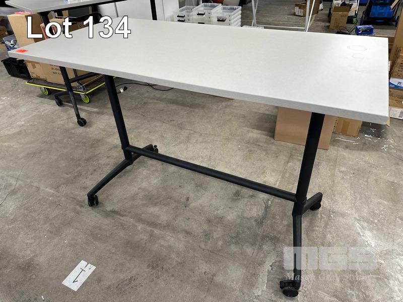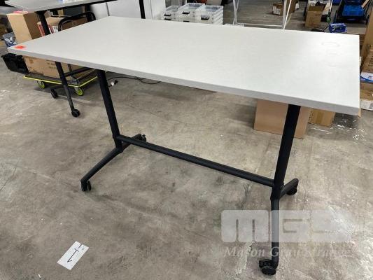 2 x FLIP TOP TABLES, MOBILE, WHITE LAMINATE TOP, EACH 150 x 75 x 105cm (HIGH)