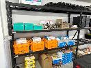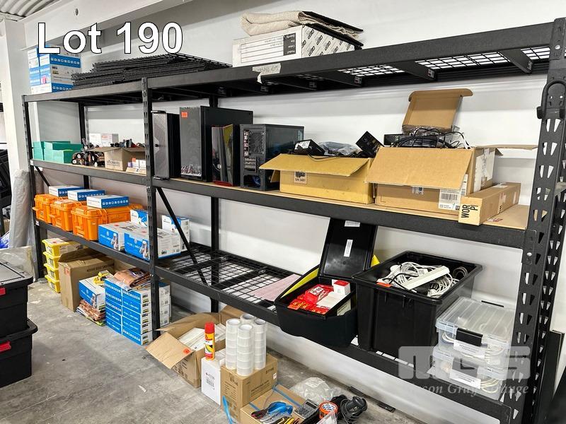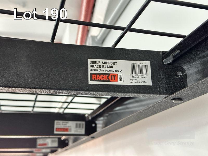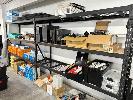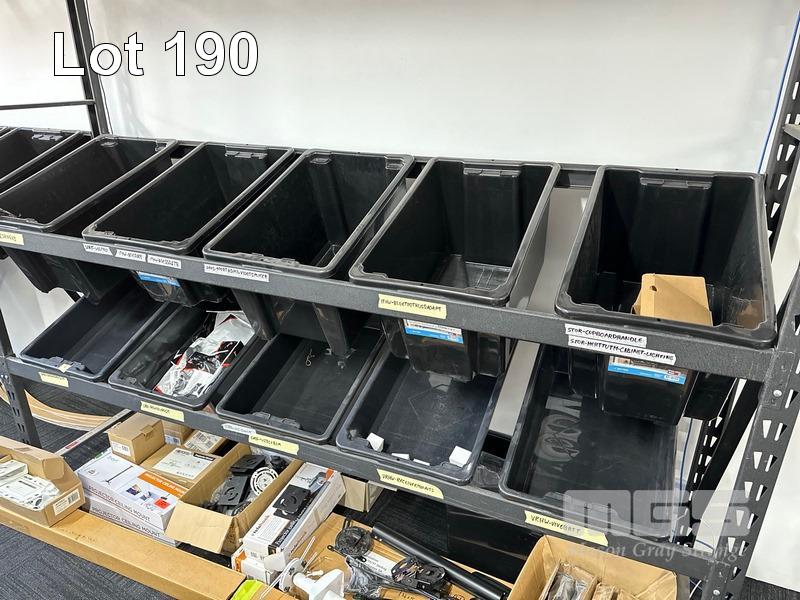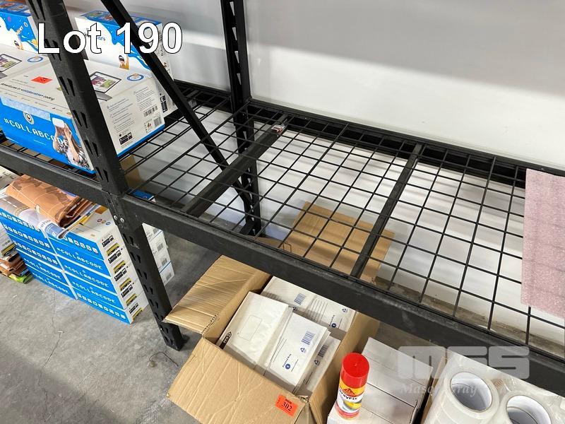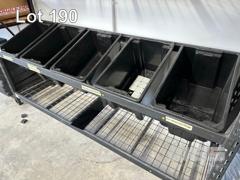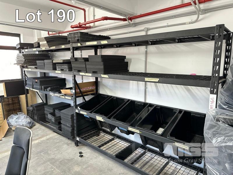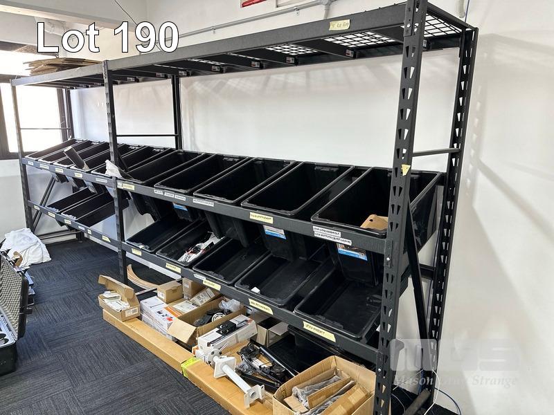 7 x BAYS STOCK SHELVING, RACK IT, COMPRISING 11 x UPRIGHTS, 2135 x 640mm, 48 x CROSSBEAMS, 2465mm, 22 x STORAGE TUBS, PLUS SPARE MESH SHELVING