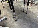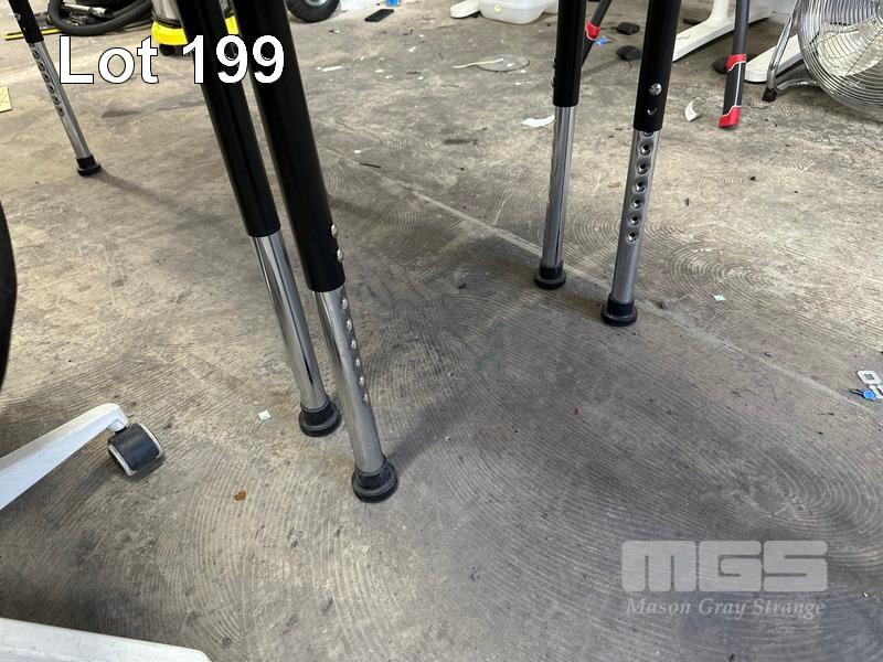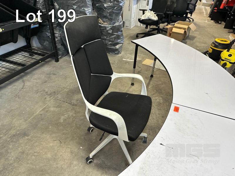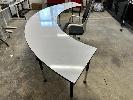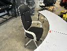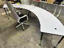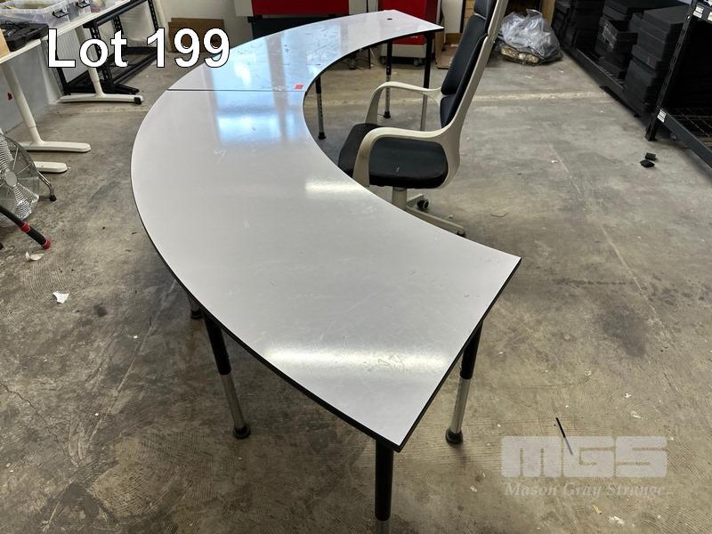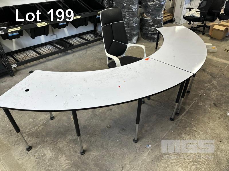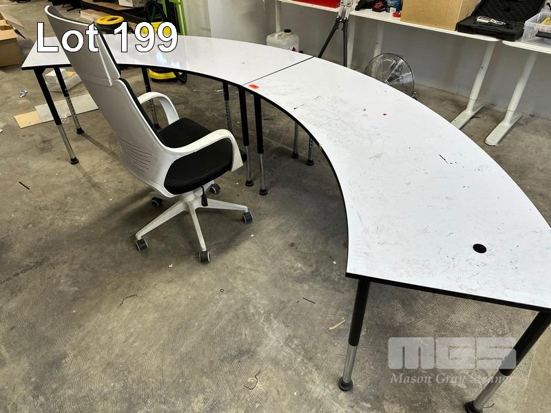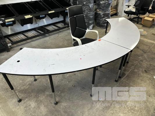 2 x CURVED TABLES, ADJUSTABLE HEIGHT, WHITE GLOSS LAMINATE TOP, EACH APPROX 190 x 60cm WITH 1 x OFFICE CHAIR