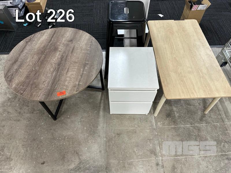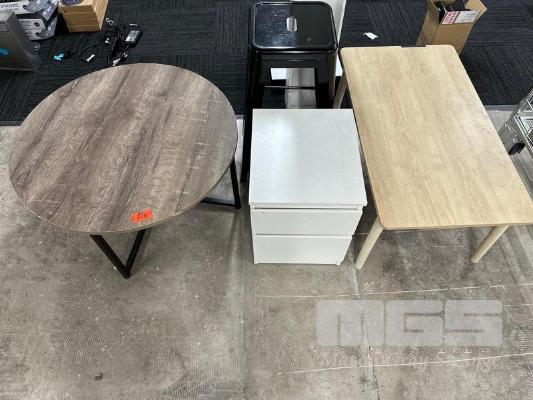 ROUND COFFEE TABLE, RECTANGLE COFFEE TABLE, 2 DRAWER CABINET & STOOL