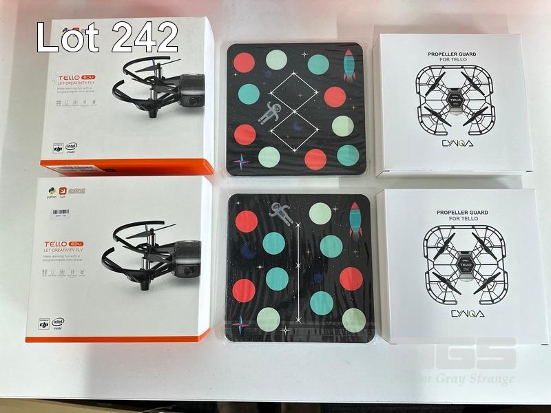 2 x DJI RYZE TELLO EDU DRONES, 2 x MISSION PAD PACKS, 2 x PROPELLER GUARDS, 4 x BATTERIES (ALL SEALED IN BOX)