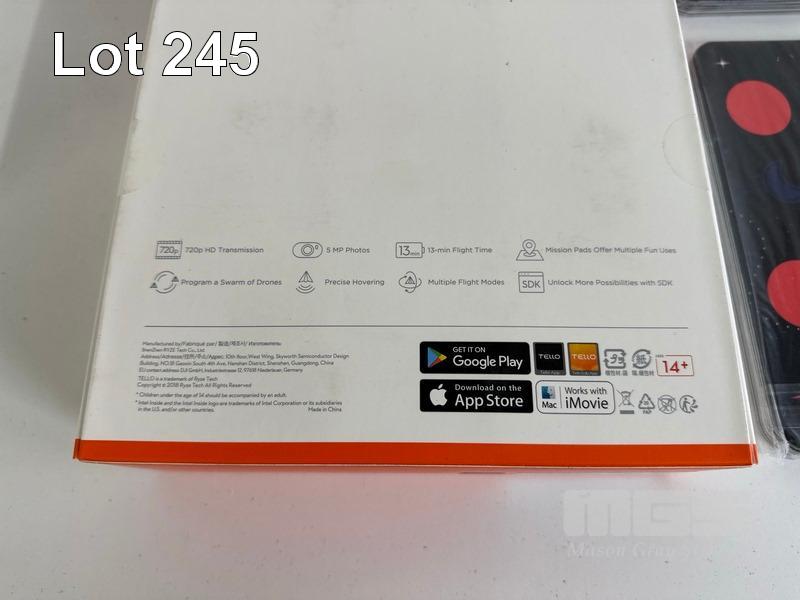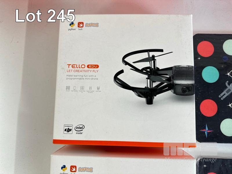 2 x DJI RYZE TELLO EDU DRONES, 2 x MISSION PAD PACKS, 2 x PROPELLER GUARDS, 4 x BATTERIES (ALL SEALED IN BOX)