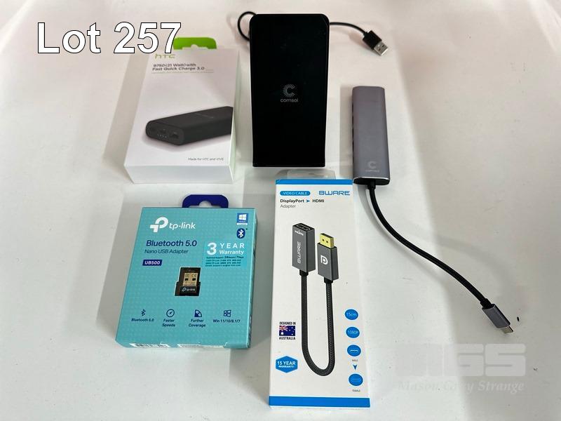 HTC 9750 (21W) POWERBANK, TP-LINK BLUETOOTH NANO USB ADAPTER, 8WARE DISPLAYPORT TO HDMI ADAPTER, COMSOL WCTW15 WIRELESS CHARGING STAND, COMSOL CMMP04 USB-C TO 4K HDMI ADAPTOR, VERBATIM OVER-EAR HEADPHONES, JOBY GORILLAPOD COMPACT TRIPOD