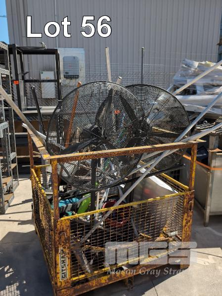 2 X WORKSHOP FANS, ASSORTED BROOMS BRUSHES ETC (CONTENTS 1 X STILLAGES)