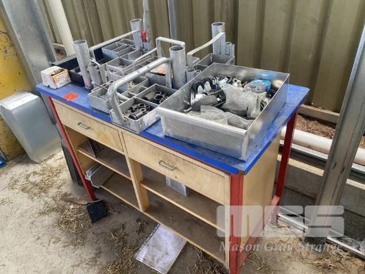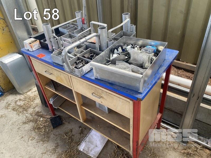 WORK BENCH, 2 DRAWER & CONTENTS FITTINGS, FASTENERS, SOCKETS, CASTOR WHEELS, ETC