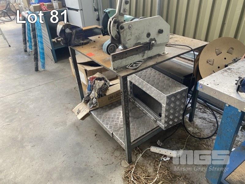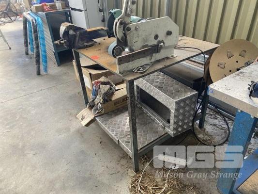 WORK BENCH STEEL FRAME/TOP FITTED WITH METAL SHEAR & RECORD VICE