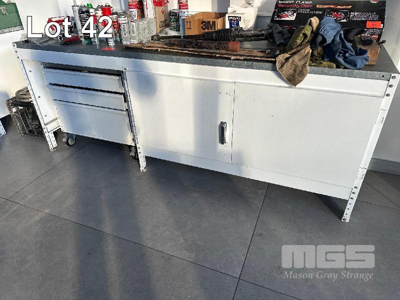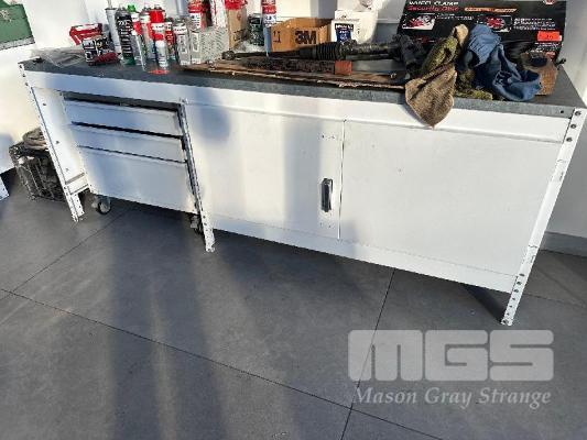 SHARMAN TECH BENCH, STEEL, WHITE BASE, GALV TOP, 2300 x 800mm 2 DOOR CABINET WITH SHELVES, 1300mm ROLL OUT SHELVES WITH 3 DRAWER MOBILE, LOCKING WHEELS