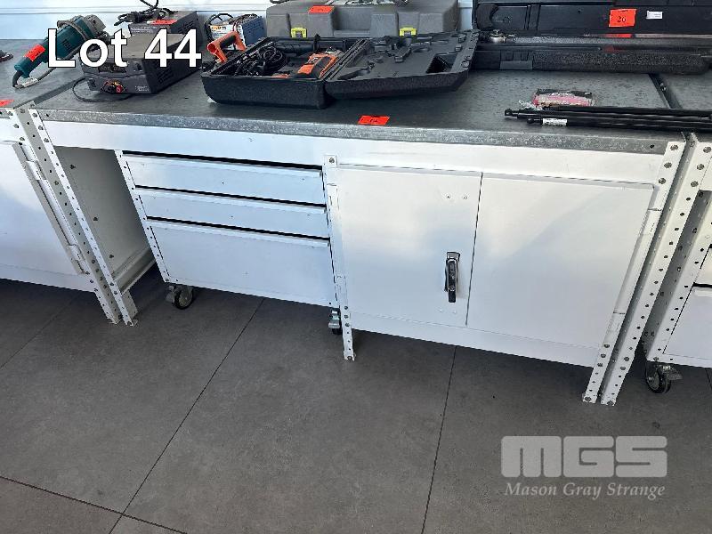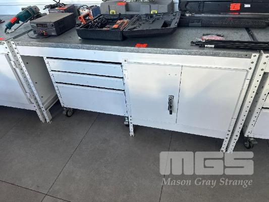 SHARMAN TECH BENCH, STEEL, WHITE BASE, GALV TOP, 1750 x 800mm 2 DOOR CABINET WITH SHELVES, 750mm ROLL OUT SHELVES WITH 3 DRAWER MOBILE, LOCKING WHEELS