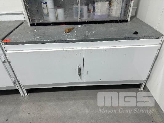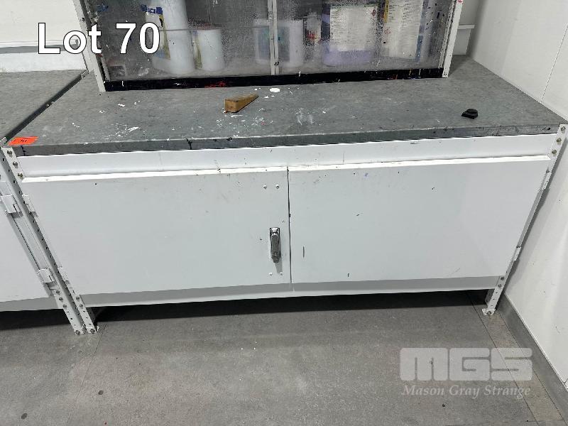 SHARMAN TECH BENCH STEEL WHITE BASE, GALV TOP, 1700 x 800mm WITH 2 DOOR CUPBOARD & ROLL OUT SHELVES