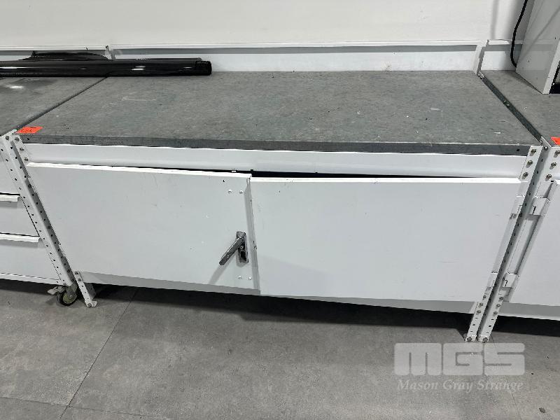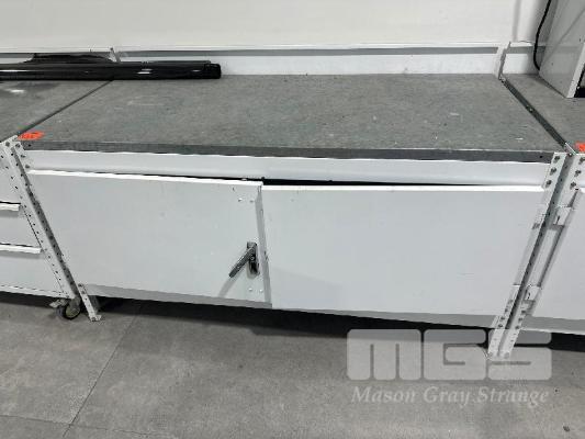 SHARMAN TECH BENCH STEEL WHITE BASE, GALV TOP, 1700 x 800mm WITH 2 DOOR CUPBOARD & ROLL OUT SHELVES