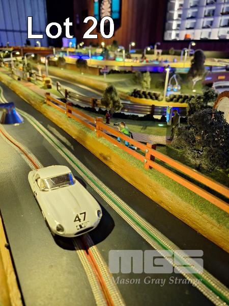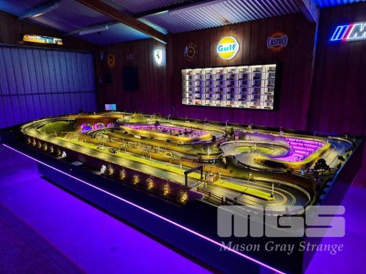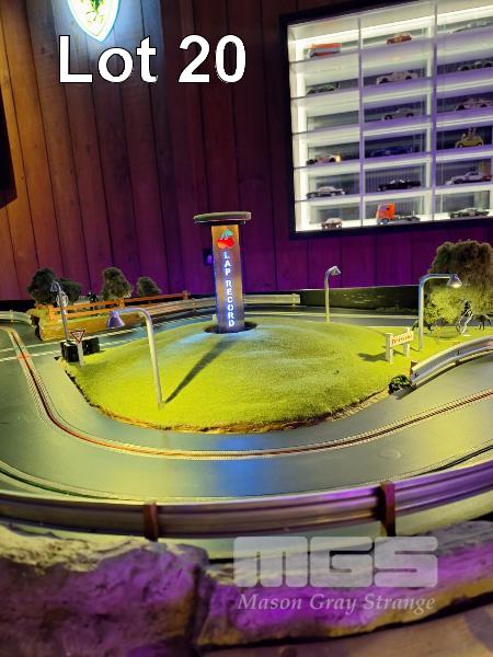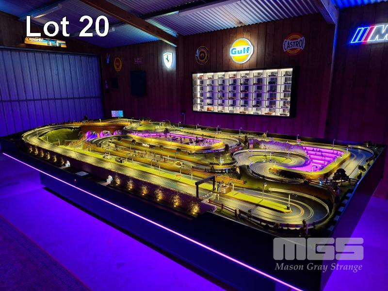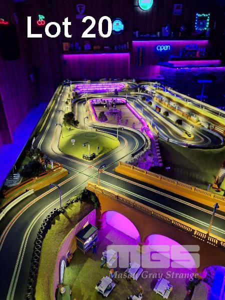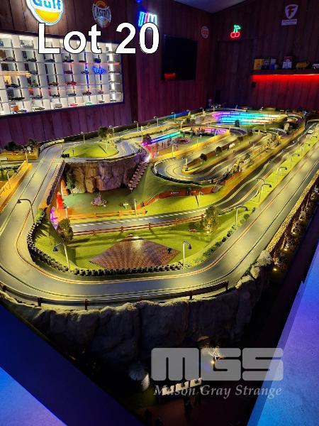 CUSTOM SLOT CAR RACE TRACK, 1:32 SCALE, TRACK TABLE SIZE, 4850 x 2220mm, 2 x 1:32 SCALE SLOT CARS INCLUDED TRACK FEATURES TIGHT CURVES, VARIOUS ELEVATION CHANGES, MULTIPLE HAIRPINS, LANE DEVIATIONS, LONG STRAIGHTS & A CROSSOVER SECTION TRACK IS EXTREMLEY DETAILED & CONSTRUCTED FROM HIGH QUALITY MATERIALS INCLUDING STAINLESS STEEL TRACK BRAID, ALLOY GUARDS, LED STRIP LIGHTING, ADAPTIVE LIGHTING & SOUND EFFECTS TRIGGERED BY 14 SENSORS, BRASS STREET LIGHTS, 10" DIGITAL DISPLAY & 7" TOUCH SCREEN CONTROL SYSTEM PAINTED & DETAILED TO REFLECT A 'DREAM' PERIOD RACE TRACK FEATURING PERIOD RACE SPONSOR DISPLAYS SUCH AS FIRESTONE, BP SUPER, TEXACO, PIRELLI, GULF, & MORE! EXTREMELY HIGH DETAILED RACE TRACK SETUP TO BE ENJOYED BY ADULTS & CHILDREN HANDCRAFTED IN AUSTRALIA 240V 10AMP VIDEO AVAILABLE ON AUCTION PAGE TRACK LOCATED IN ADELAIDE, INSPECTION BY APPOINTMNENT ONLY