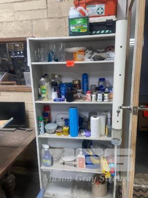 BOOK SHELF & ASSORTED CONDIMENTS, FIRST AID, ETC