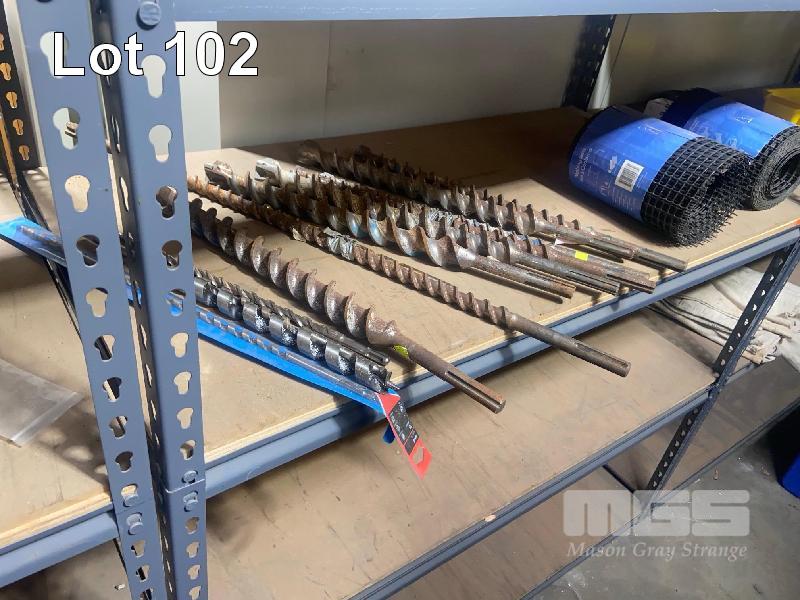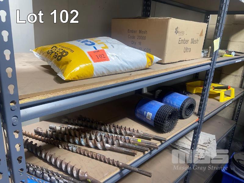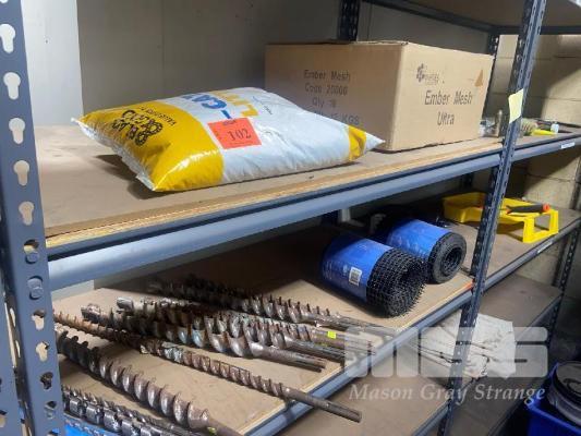 1 x NEW ROLL BARRIER MESH, DYNA DRILL BITS, LONG SERIES, TROWELS, SILICONES, PAINT EQUIPMENT, ETC CONTENTS OF 3 x RACKS, (NOT INCLUDING RACKS)