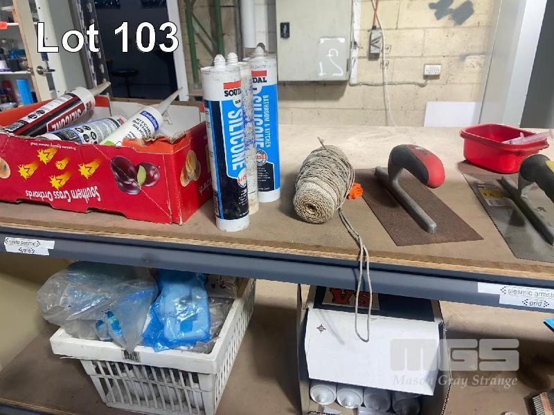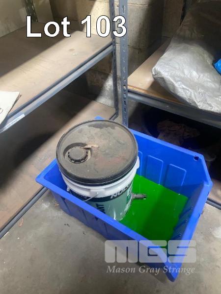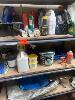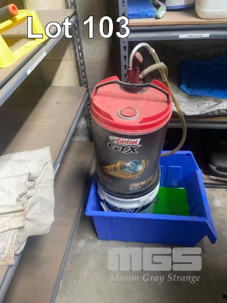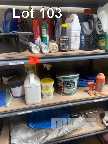 OILS, LUBRICANTS, COOLANT, 20 LITRE OIL DRUM, TARPS, FIBREGLASS KIT, SAFETY PPE, GLASSES, ETC CONTENTS OF 2 x RACKS, (NOT INCLUDING RACKS)