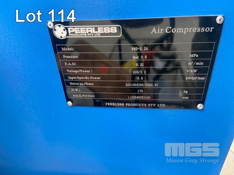 PACKAGED AIR COMPRESSOR, PEERLESS MOD: WMS2.2A 2.2kw MAX PRESSURE: 0.8MPA 1 HOUR SHOWING 240V INBUILT DRYER