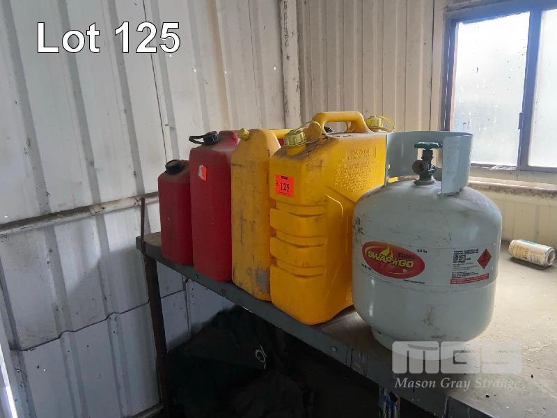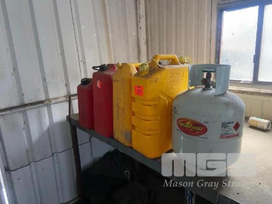 4 x FUEL DRUMS INCLUDING 2 @ DIESEL, 20 LITRE, 1 @ PETROL, 20 LITRE, 1 @ PETROL, 10 LITRE & GAS BOTTLE, 8.5kg