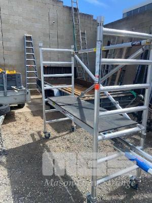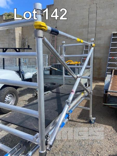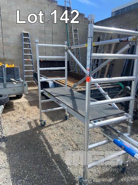OLDFIELDS ZIPPY SCAFFOLD FOLDOUT 190cm (H) x 70cm PLATFORM WITH HATCH, 180 x 56cm 225kg RATED 1 x BAR 2 x STABILIZERS