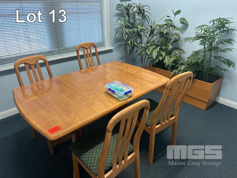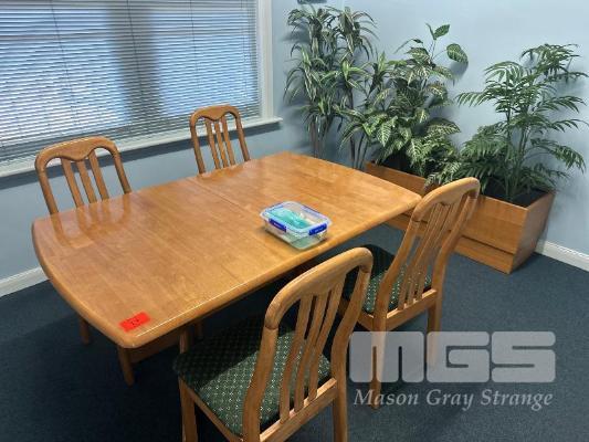 TIMBER DINING TABLE, EXTENDABLE, 1500 x 970mm CLOSED, 4 x MATCHING CHAIRS & PLANTER BOXES