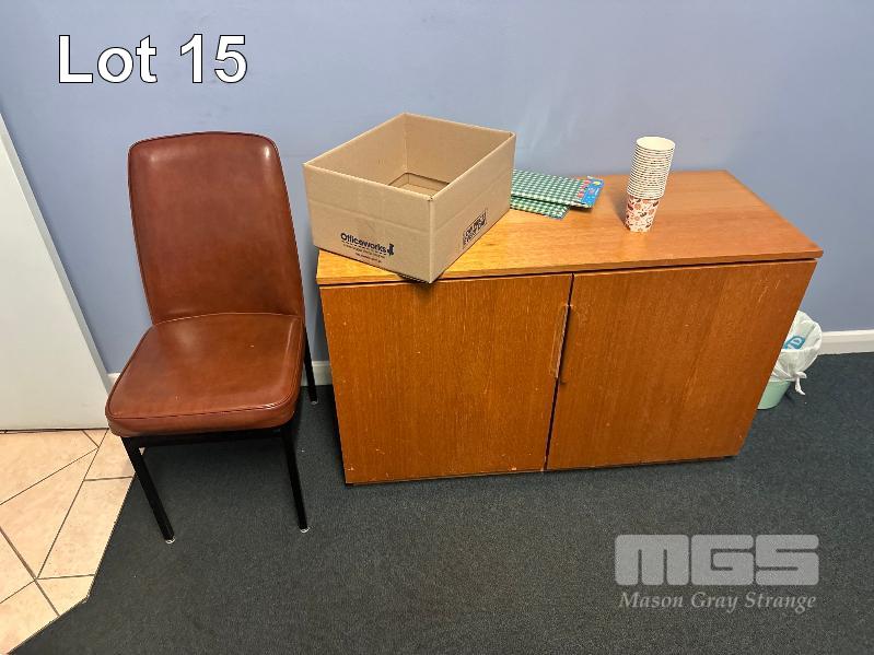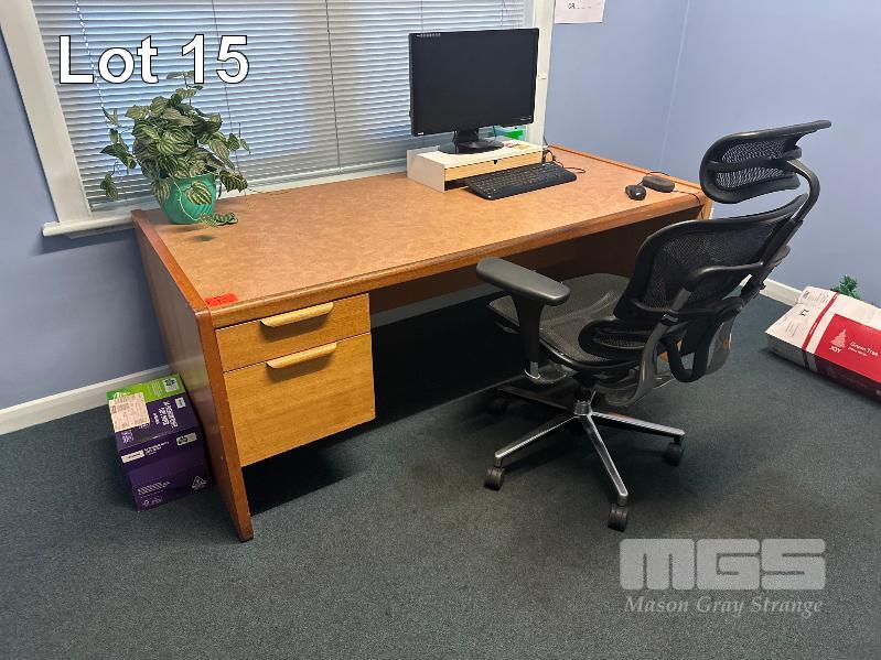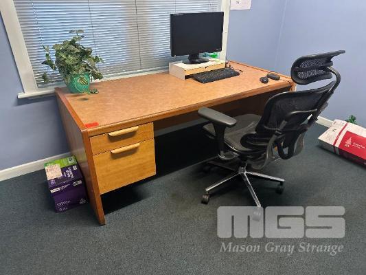 CONTENTS OF OFFICE INCLUDING, 2 x TIMBER DESKS, CREDENZA, GAS LIFT CHAIR & VISITOR CHAIR
