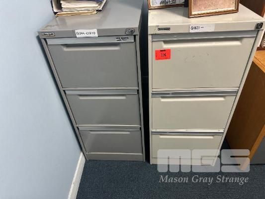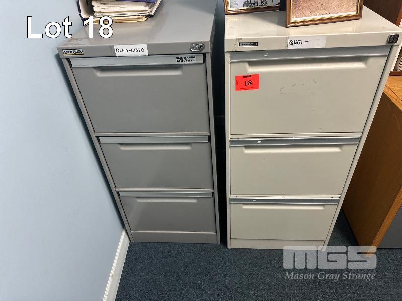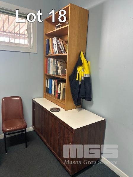 CONTENTS OF OFFICE INCLUDING, TIMBER DESK & RETURN, 2 x MOBILES, 2 x 3 DRAWER FILING CABINETS, CREDENZA & BOOKSHELF