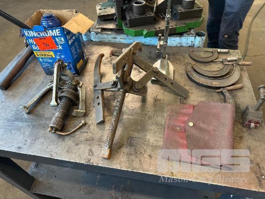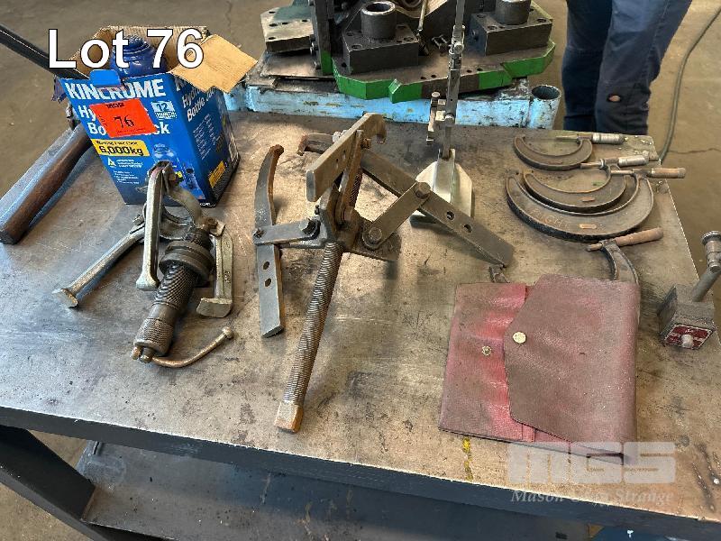 ASSORTED METROLOGY, MICROMETER, HEIGHT GAUGE, MAG BASE DIAL INDICATOR, 2 x GEAR PULLERS & HEAVY DUTY JACK, 6 TONNE