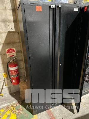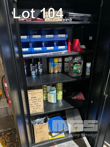 STEEL STOCK CUPBOARD, 2 DOOR & CONTENTS DEGREASER, PAINTS, METHO, PACKING TAPE & WIRE WHEELS