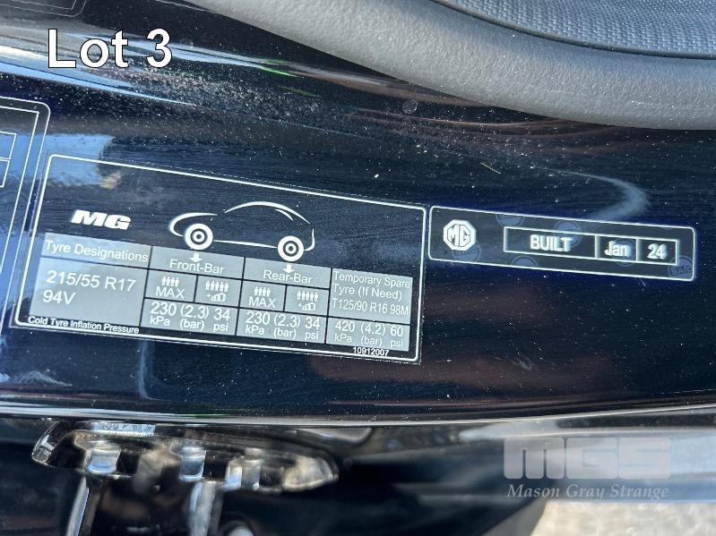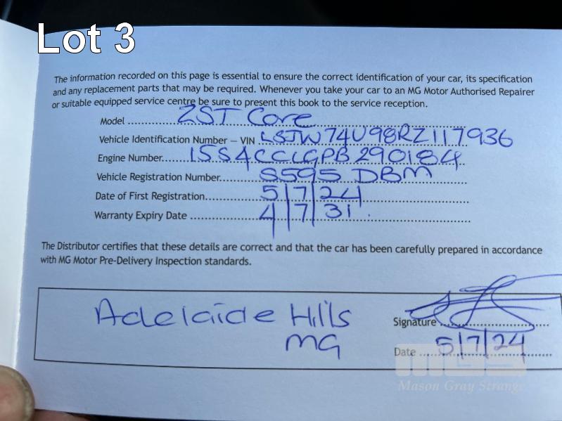 2024 MG ZS SUV FWD REG: S595 DBM (SA) VIN: LSJW74U98R7117936 ENG: I5S4CCLGPB290184 ODO: 9,355kms 1.5L EFI, AUTO, BLACK, 5 DOORS, 5 SEAT, FWD ABS, AIR BAG, AIR CON, ALLOY WHEELS, BLUETOOTH, CENTRAL LOCKING, CRUISE CONTROL, IMMOBILISER, POWER STEERING, POWER WINDOWS, SPARE WHEEL, REVERSING CAMERA KEY #34 (NO PAPERS, WITH 2 KEY/S, WITH OWNER'S MANUAL, WITH SERVICE BOOKS)
