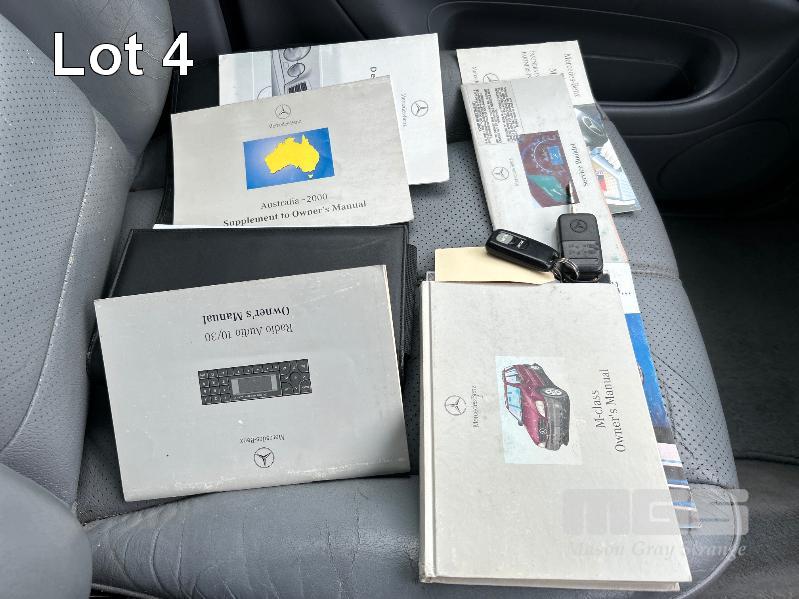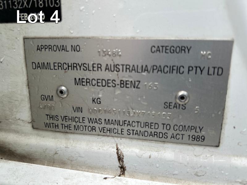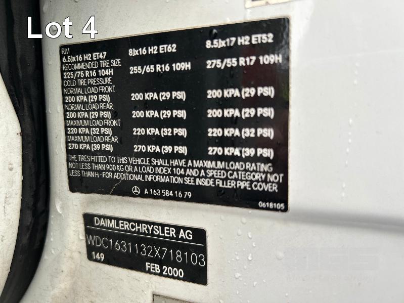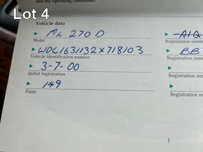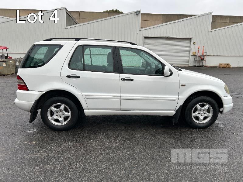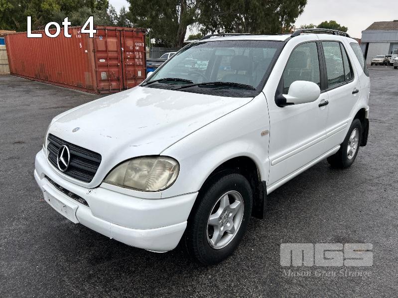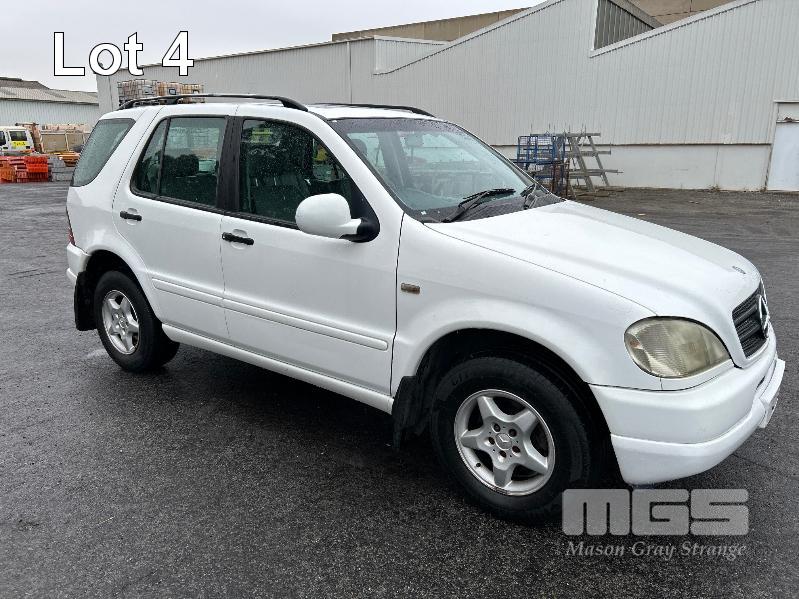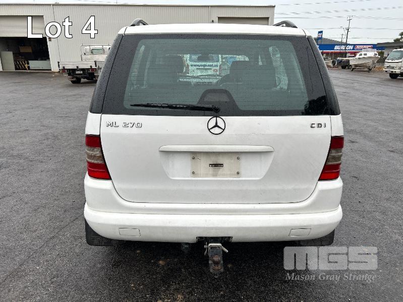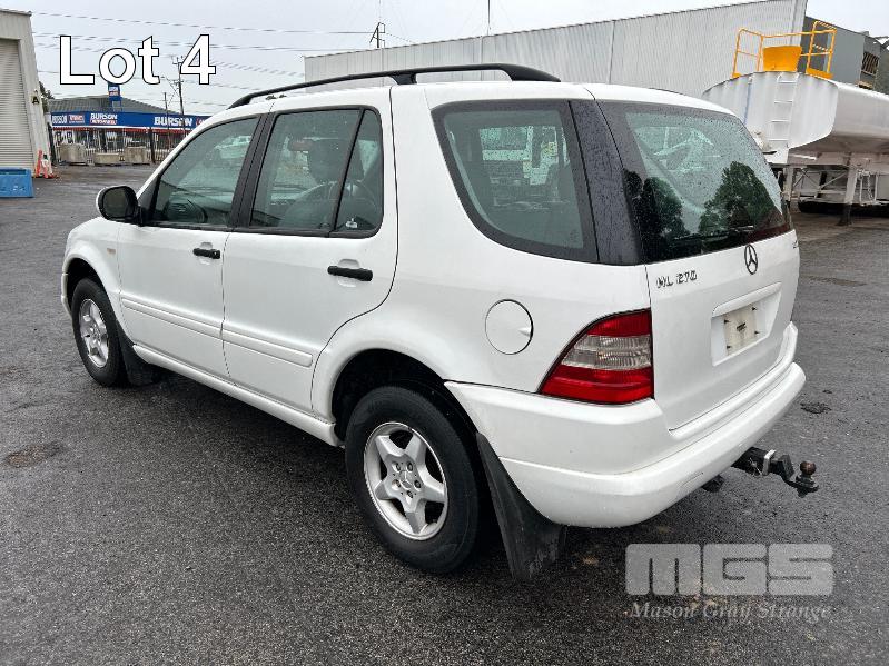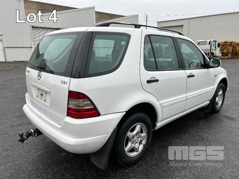 2000 MERCEDES BENZ ML270 CDI 163 SUV 4x4 REG: NO PLATES VIN: WDC1631132X718103 ENG: 61296330024032 ODO: 371,788kms SHOWING 2.7 LITRE DIESEL, 5 SPEED AUTOMATIC TRANSMISSION, WHITE DUCO, 4 DOORS, 5 SEAT, 4x4 AIR BAG, AIR CON, ALLOY WHEELS, CD PLAYER, CENTRAL LOCKING, CRUISE CONTROL, IMMOBILISER, POWER STEERING, POWER WINDOWS, SPARE WHEEL, SUNROOF, TOW BAR, FULL SERVICE HISTORY & RECEIPTS IN OFFICE KEY #50 (WITH 1 KEY/S, WITH OWNER'S MANUAL, WITH SERVICE BOOKS)