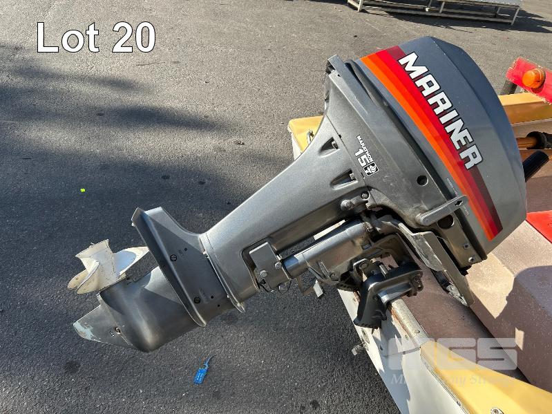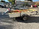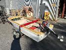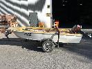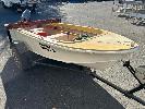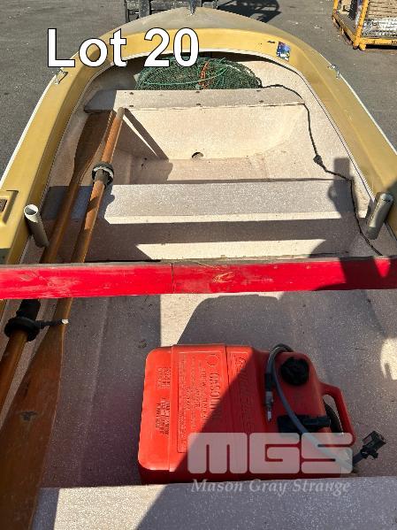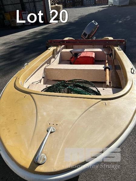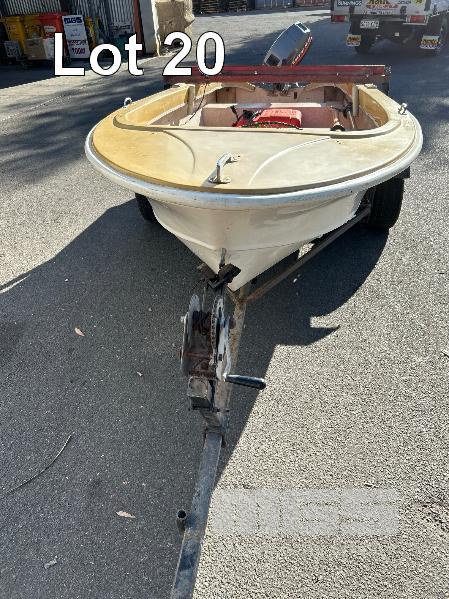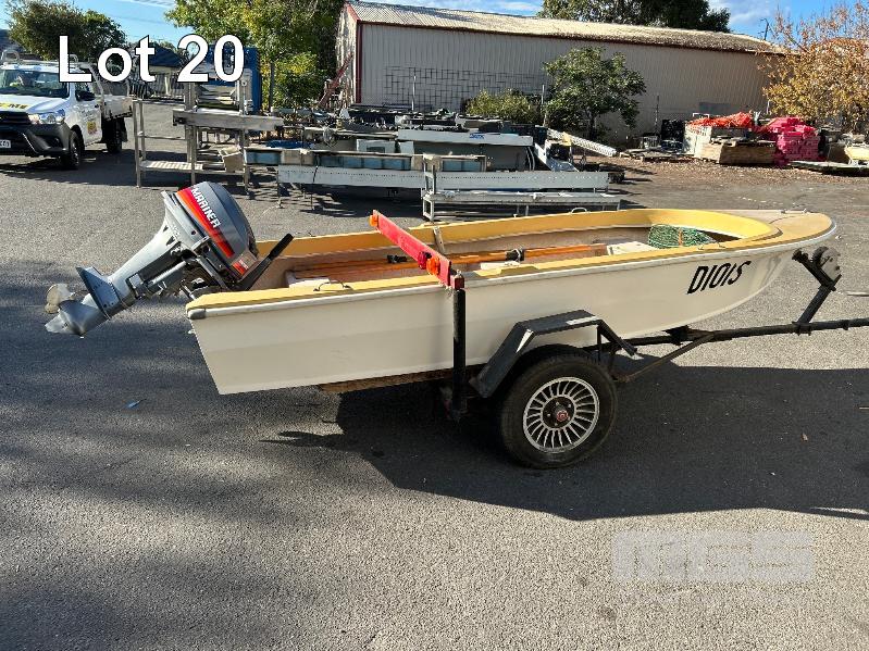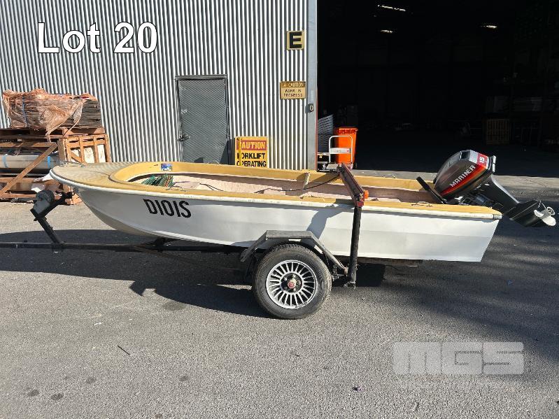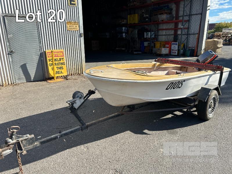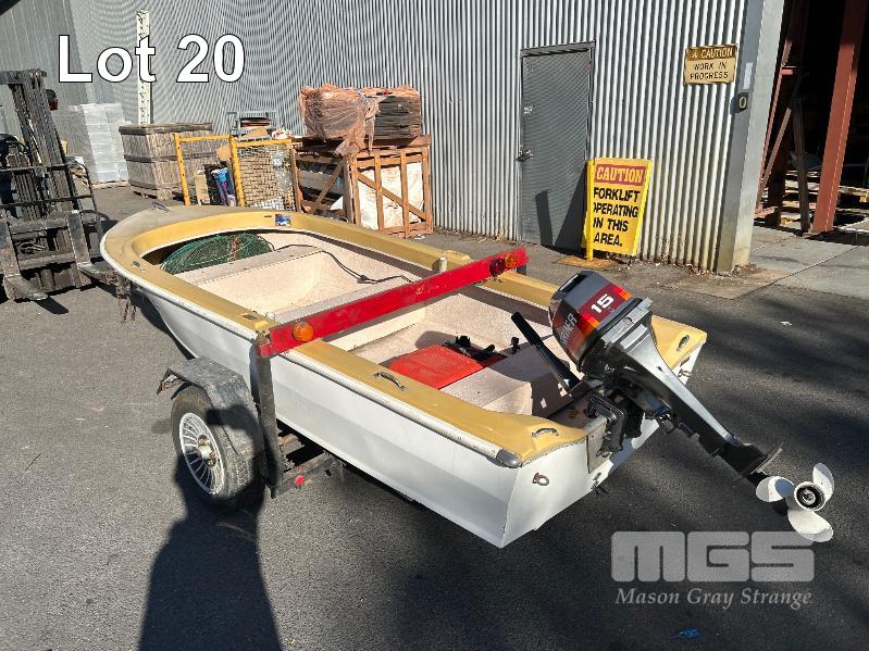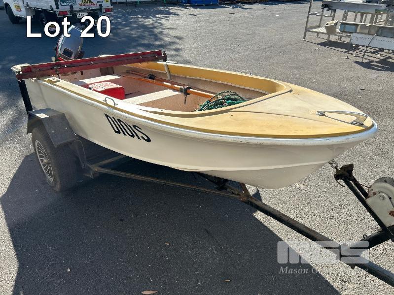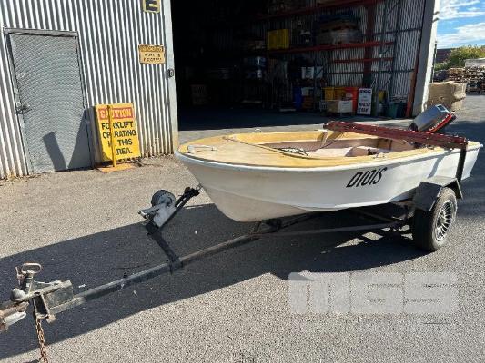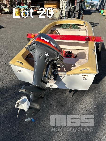 FIBREGLASS DINGHY, 3.6m OPEN HULL, MARIN REGO NO. D101S POWERED BY MARINER 15HP MARATHON OUTBOARD ENGINE WITH OARS, YABBY NETS & FUEL TANK ON SINGLE AXLE TRAILER REG: NO PLATES BALL HITCH WITH HAND WINCH & LIGHT BAR
