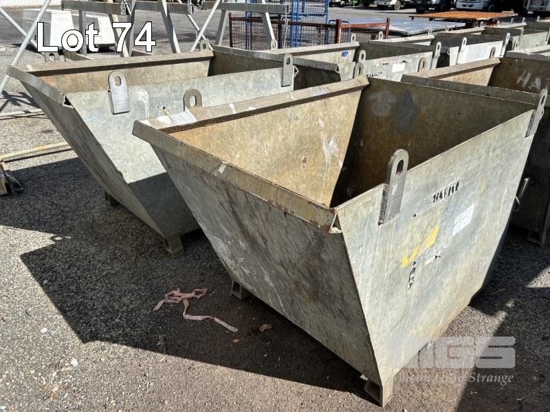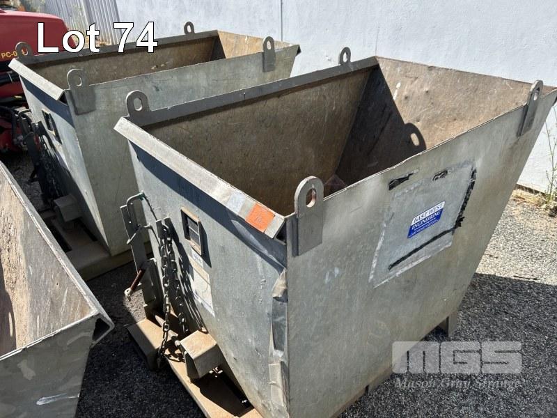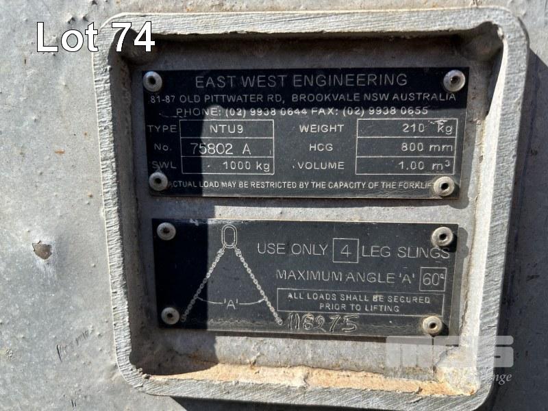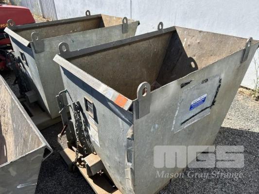 2 x TIPPER BINS, FORK MOUNT, EAST WEST ENGINEERING GALV STEEL TYPE: NTU9 SWL: 1,000kg VOLUME: 1m3 WEIGHT: 210kg 930 x 1450 x 1000mm (H)