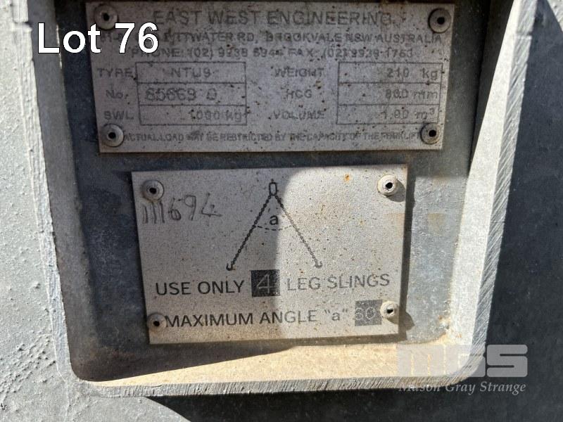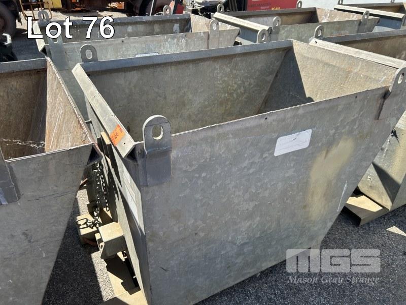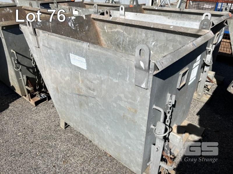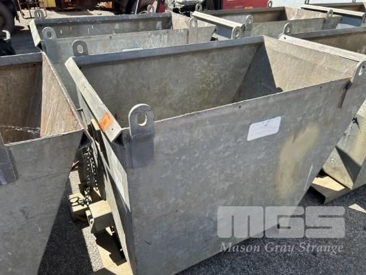 2 x TIPPER BINS, FORK MOUNT, EAST WEST ENGINEERING GALV STEEL TYPE: NTU9 SWL: 1,000kg VOLUME: 1m3 WEIGHT: 210kg 930 x 1450 x 1000mm (H)