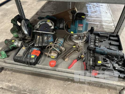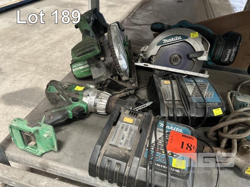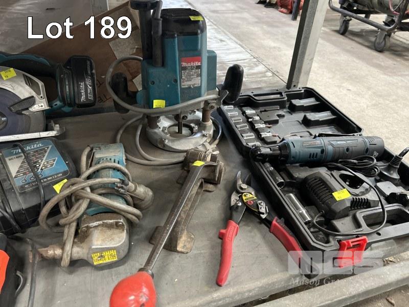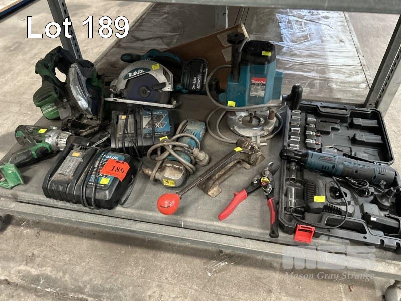 MAKITA PLUNGE ROUTER, 240V, MAKITA CORDLESS CIRCULAR SAW WITH BATTERY & 2 x CHARGERS, HITACHI SAW & DRILL NO BATTERY OR CHARGER, CORDLESS RATCHET S-LONG IN KIT, NIBBLER, ETC 1 x SHELF