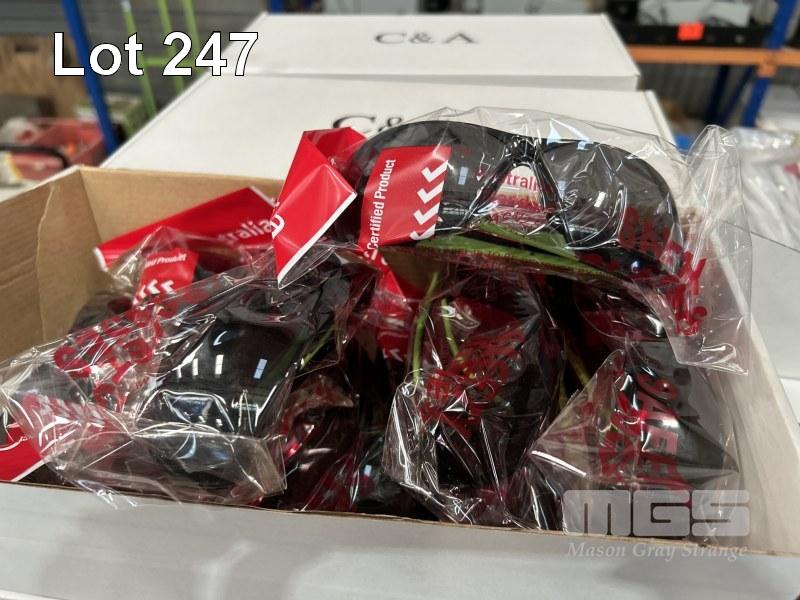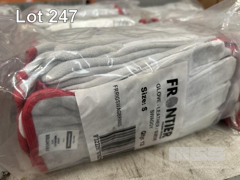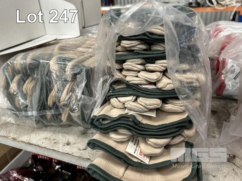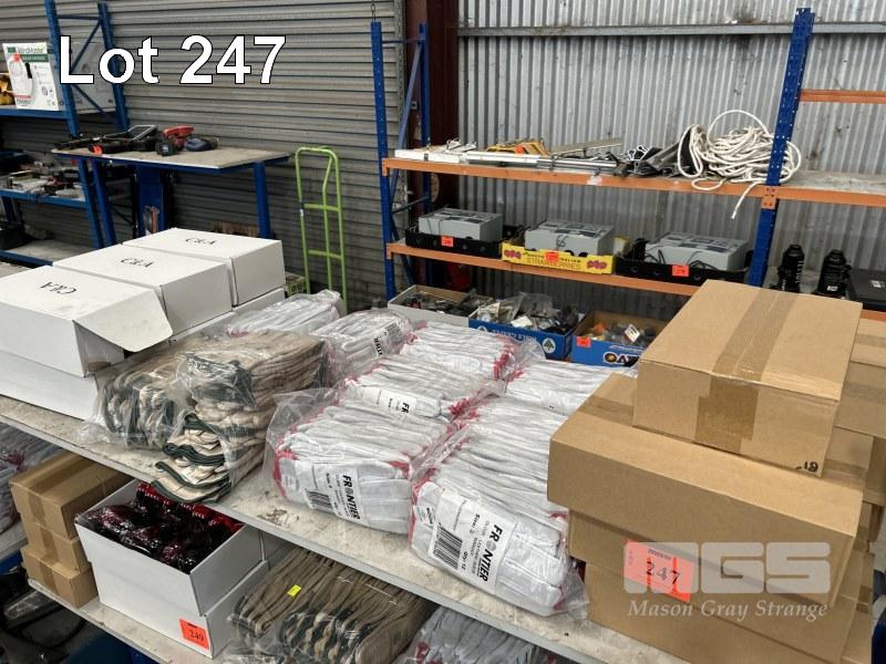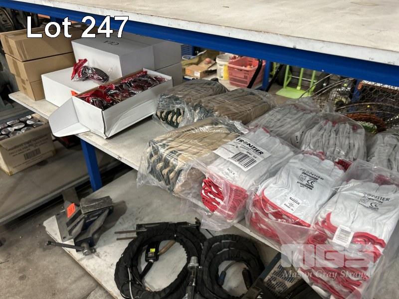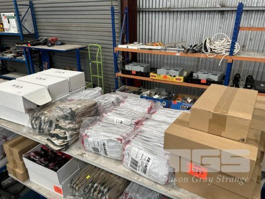 WORK SAFTEY EQUIPMENT, INC. SAFETY GLASSES, C&A AUST, TINTED, 6 x BOXES, (12 PAIRS/BOX), 8 x BAGS WORK GLOVES, FRONTIER SUEDE LEATHER, SMALL (12 PAIRS/BAG) 2 x BAGS LEATHER GLOVES, PRO SAFE, RIGGA MATE, MEDIUM (12 PAIR/BAG) 10 x BOXES OF BELT CLIPS (1 x SHELF)