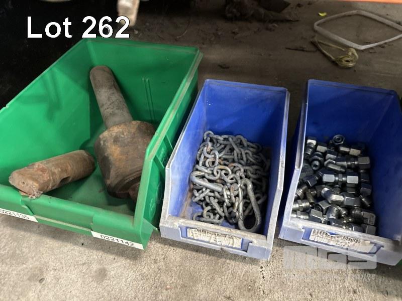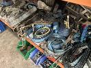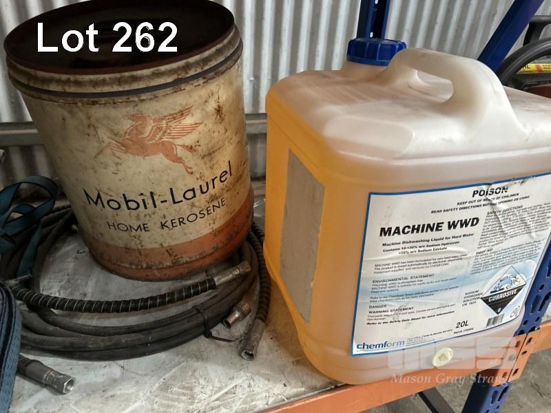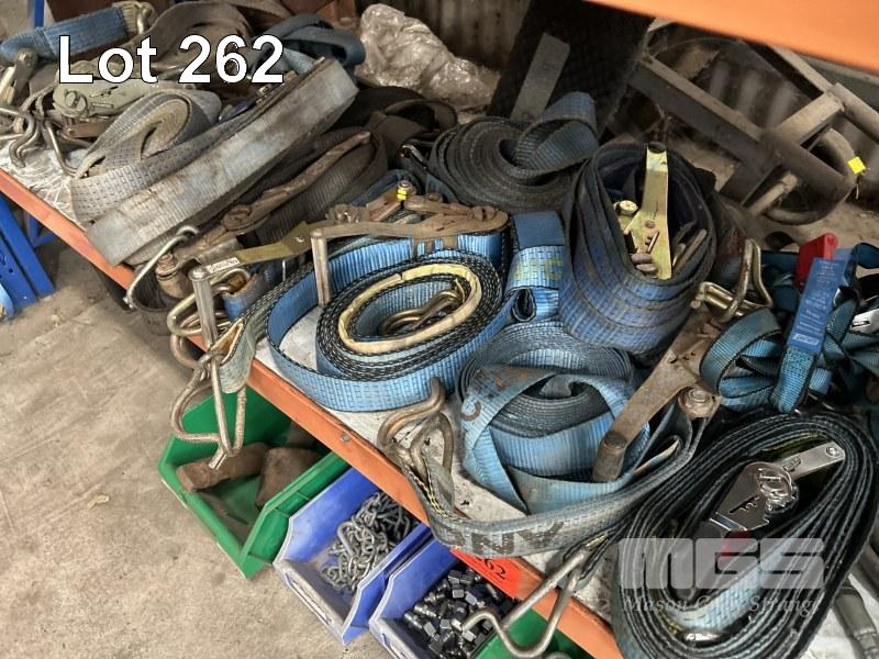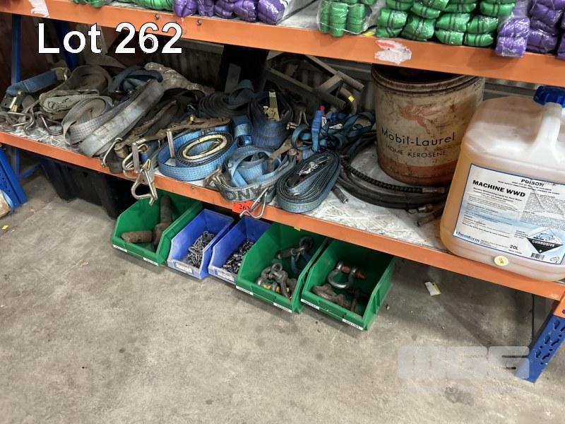 10 x TRUCK RATCHET STRAPS, D SHACKLES HYDRAULIC HOSE & FITTINGS VINTAGE KERO DRUM, PART DRAWS, DEGERGENT CLEANER, MACHINE WWD 20 LITRE, ETC. (1 x SHELF)