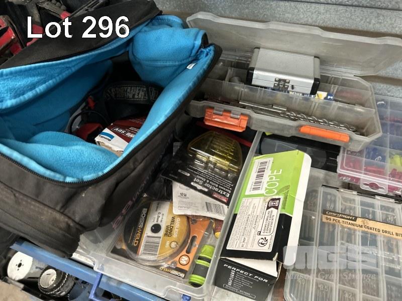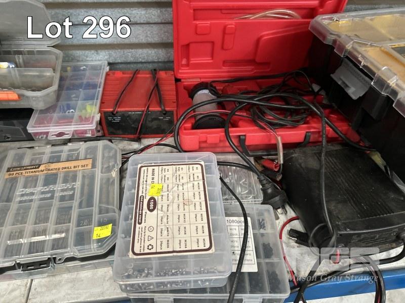 4 x BATTERY CHARGERS, ARLEC & PROJECTA, DIE GRINDER,MULTI METER TESTER, 3 x CASES DRILLS BITS & DRIVERS, HAND TOOLS, ETC 1 x SHELF