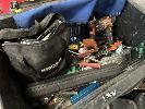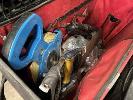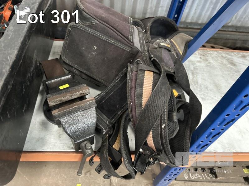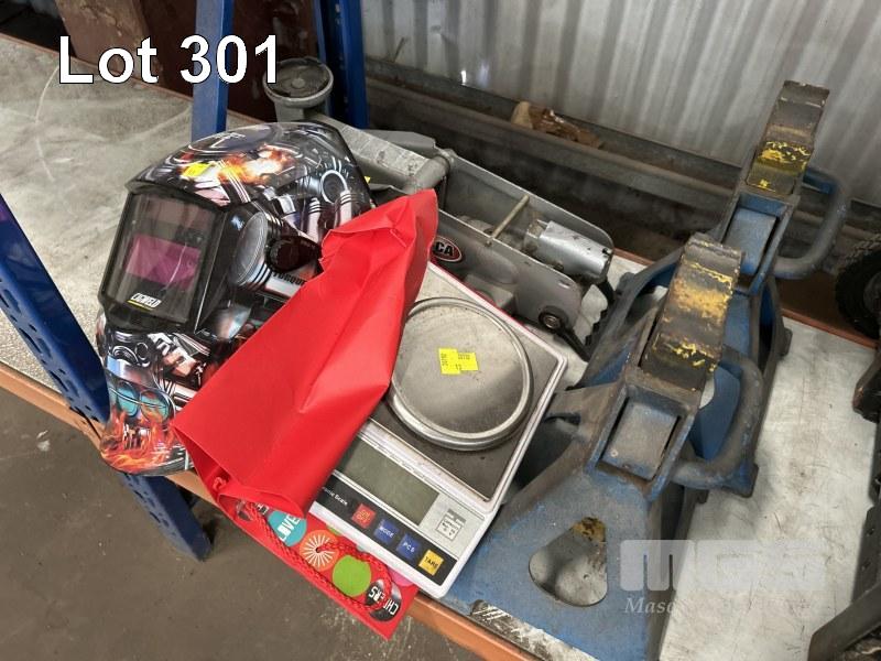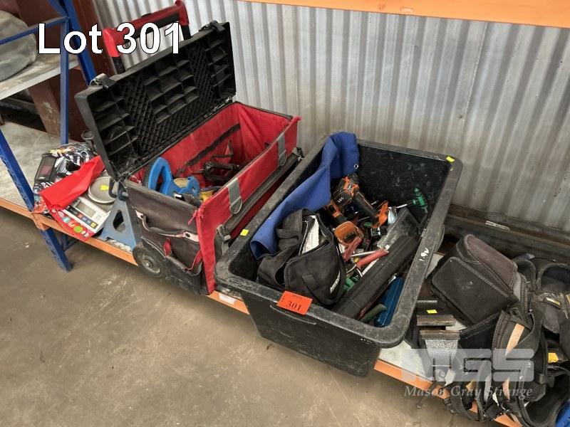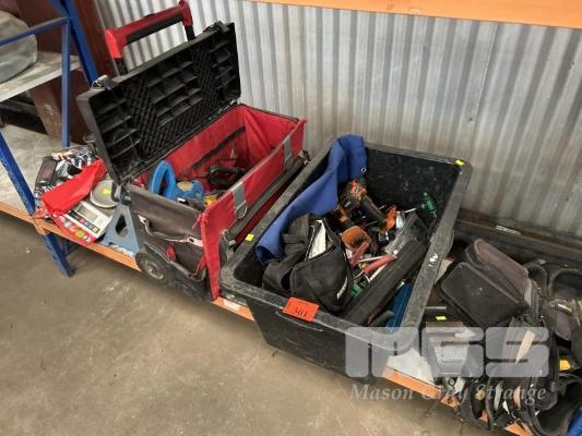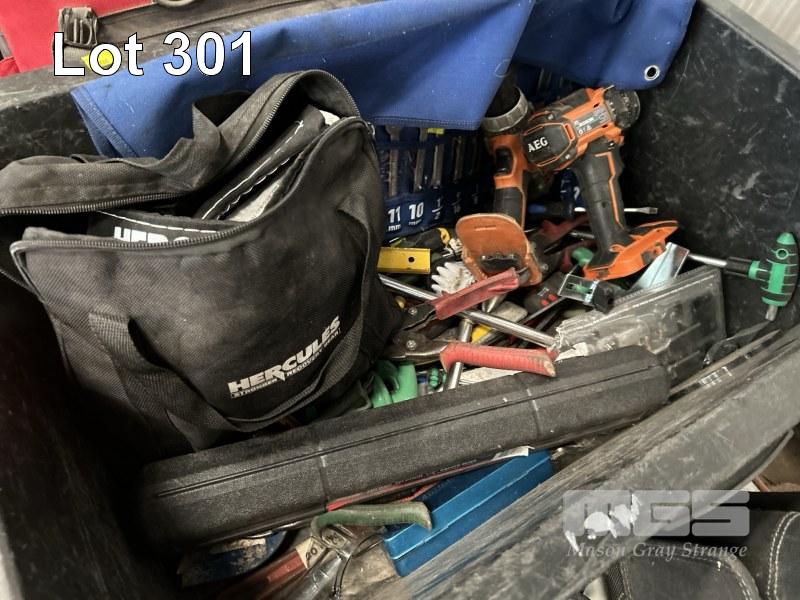 HAND TOOLS INCLUDING KINGCROME COMBINATION SPANNER SET, METRIC & IMPERIAL, 23 PIECES, TORQUE WRENCH, TOLEDO, DIE GRINDER, AEG CORDLESS DRILL, TOOL BELTS, VICE, TROLLEY JACK, CHASSIS STANDS, ETC 1 x SHELF