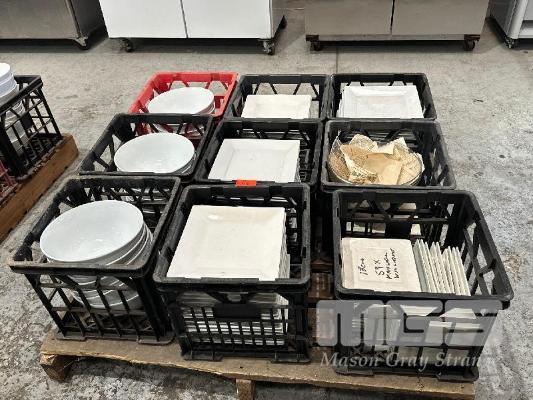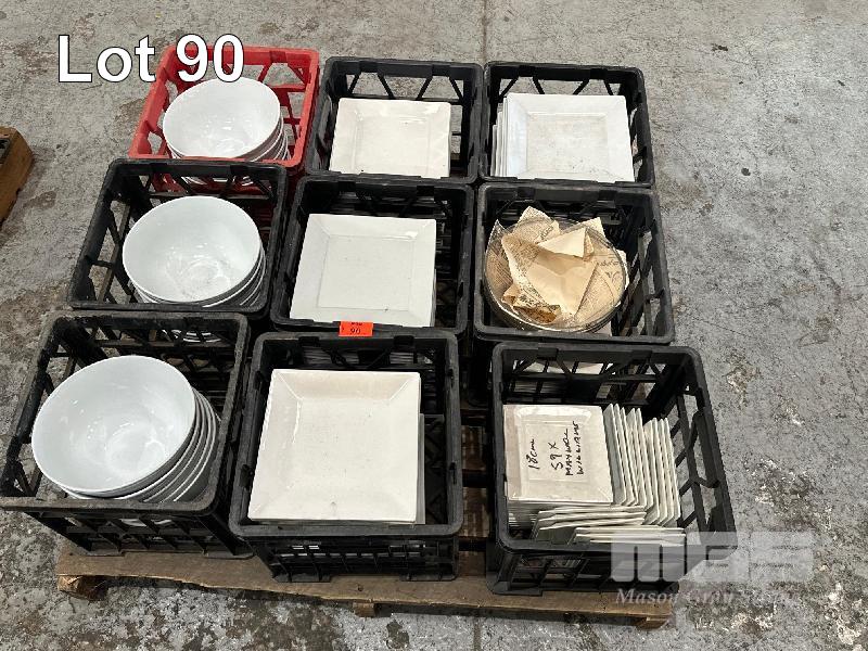 20 (APPROX) x WHITE BOWLS, 27cm, 70 (APPROX) x SQUARE PLATES, 26 x 26cm, 4 x GLASS BOWLS, 27cm & 59 (APPROX) SQUARE x PLATES, 18 x 18cm