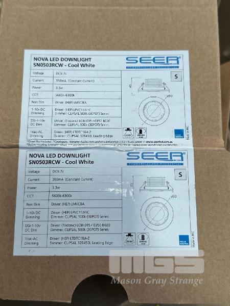48 x NOVA LED DOWNLIGHTS, COOL WHITE, SEER MOD: SN05403RCW 90mm 9.3V