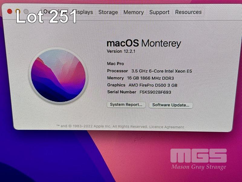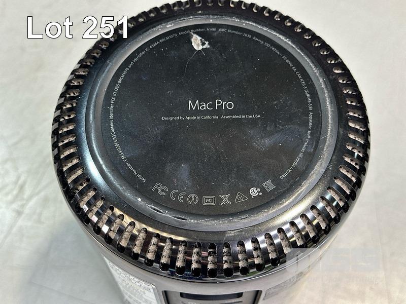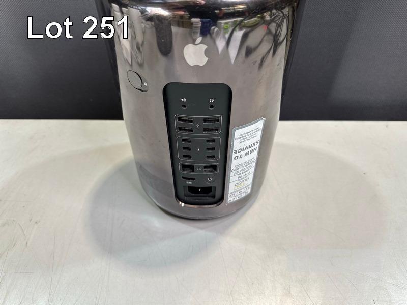 APPLE MAC PRO "CYLINDER" (A1481), XEON E5-1650 v2 @ 3.5GHz, 16GB ECC DDR3 RAM, 256GB SSD, 2 x 3GB AMD FIREPRO D500 VIDEO, Wi-Fi, BLUETOOTH, MAC OS 12 INSTALLED (NO CABLE, NO KEYBOARD, NO MOUSE) S/N:F5KS902BF693