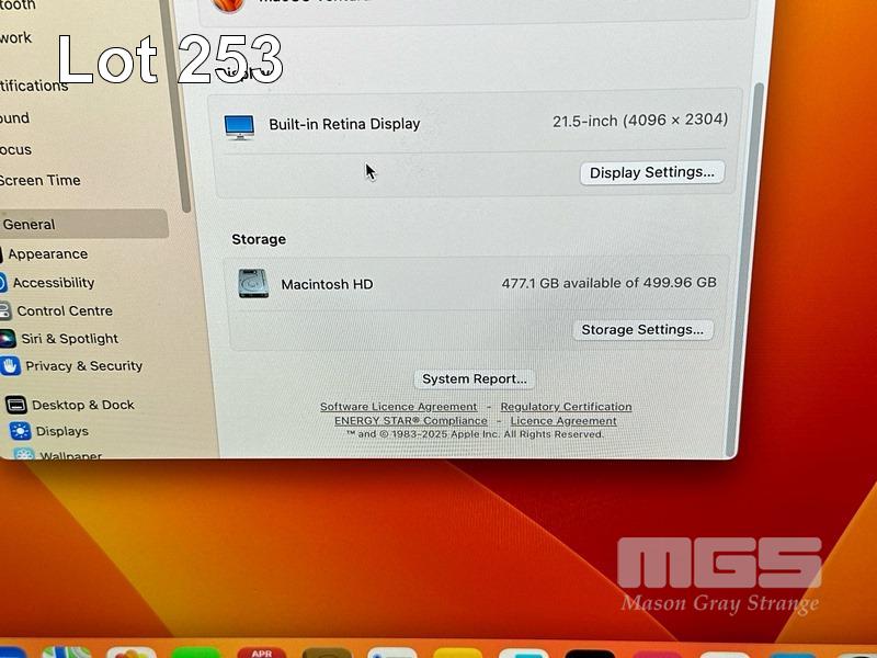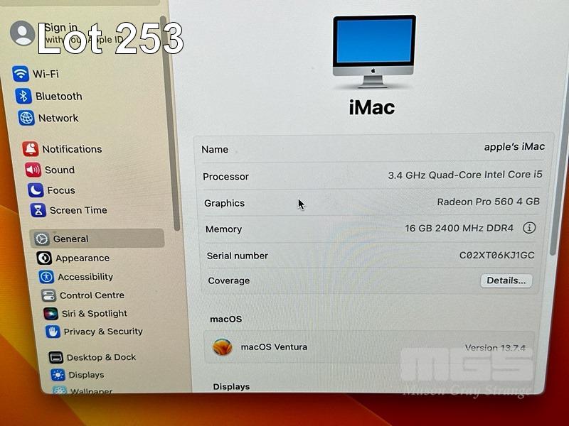 APPLE iMAC (A1418), CORE i5 7500 (7TH GEN) @ 3.4GHz, 16GB DDR4 RAM, 512GB SSD, BUILT-IN 21.5" RETINA DISPLAY (4096x2304), 4GB RADEON PRO 560 VIDEO, Wi-Fi, BLUETOOTH, MAC OS 13 INSTALLED (NO KEYBOARD, NO MOUSE) S/N:C02XT06KJ1GC