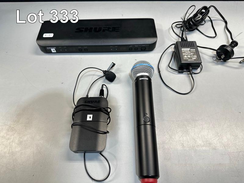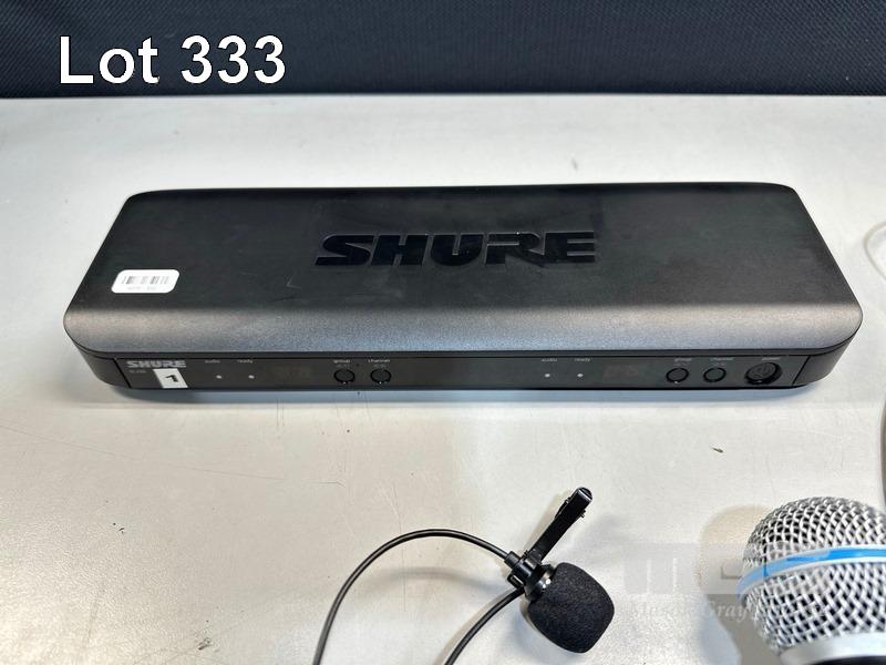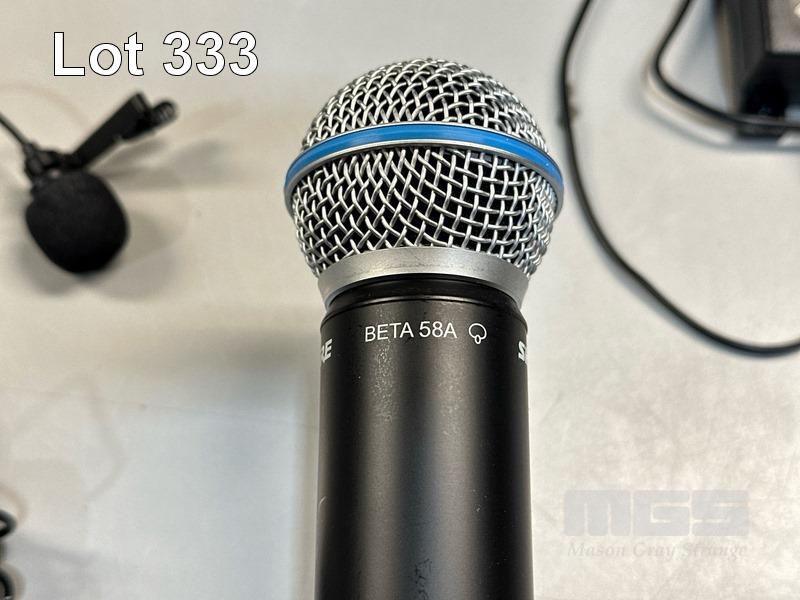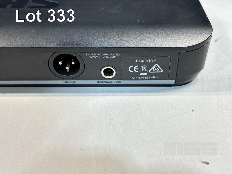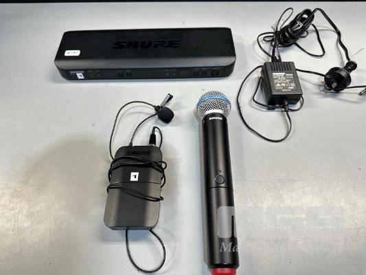 SHURE BLX88 K14 DUAL WIRELESS RECEIVER, 614-638MHz WITH SHURE BETA 58A BLX2 HANDHELD MICROPHONE, SHURE BLX1 BODYPACK TRANSMITTER & LAPEL MICROPHONE