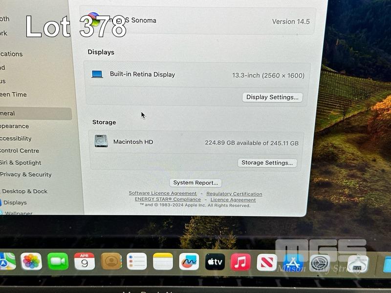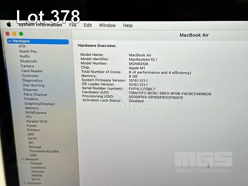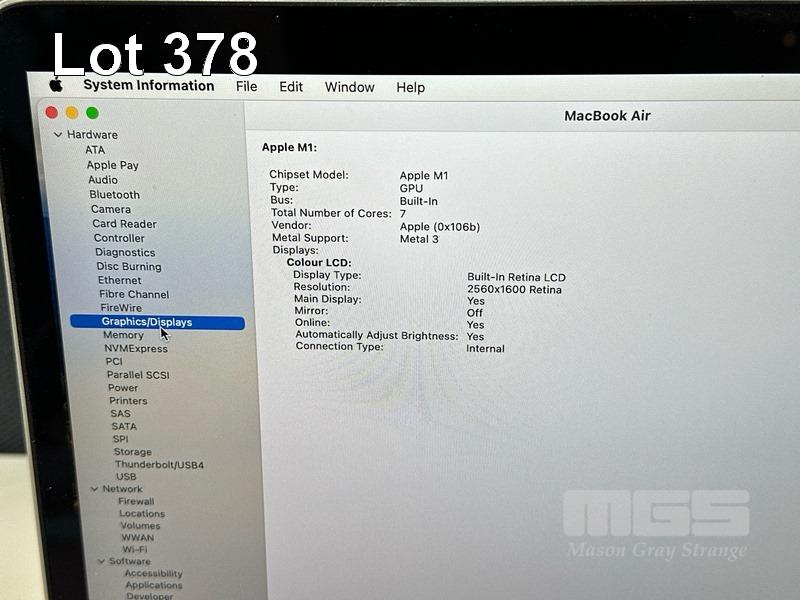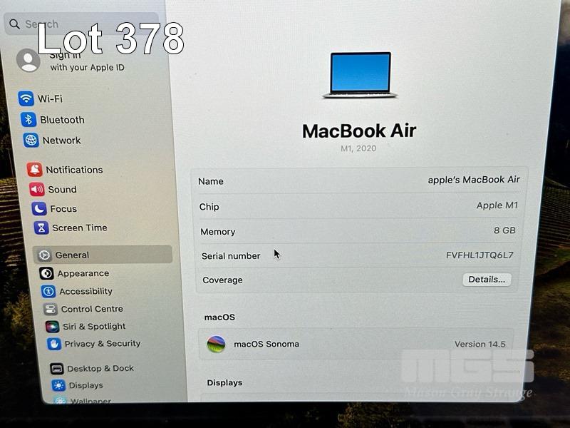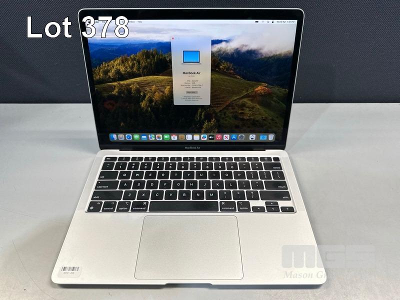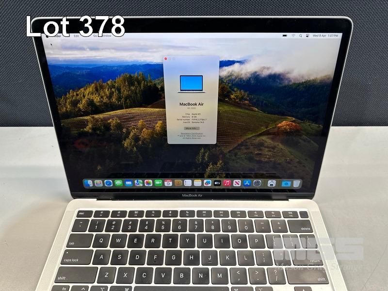 LAPTOP, APPLE MACBOOK AIR (A2337), MGN93X/A, APPLE M1 8 CPU, 7 GPU, 8GB RAM, 256GB SSD, 13.3" RETINA DISPLAY (2560x1600), Wi-Fi, BLUETOOTH, MAC OS 14 INSTALLED (NO USB-C POWER SUPPLY) (NOTE: 1 x USB-C PORT FAULTY) S/N:FVFHL1JTQ6L7