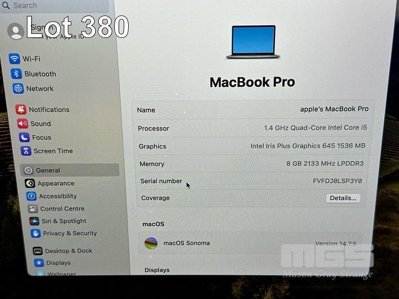LAPTOP, APPLE MACBOOK PRO (A2289), CORE i5 8257U (8TH GEN) @ 1.4GHz, 8GB DDR3 RAM, 512GB SSD, 13.3" RETINA DISPLAY (2560x1600), INTEL IRIS PLUS GRAPHICS 645, Wi-Fi, BLUETOOTH, MAC OS 14 INSTALLED & USB-C POWER SUPPLY S/N:FVFDJ0LSP3Y0