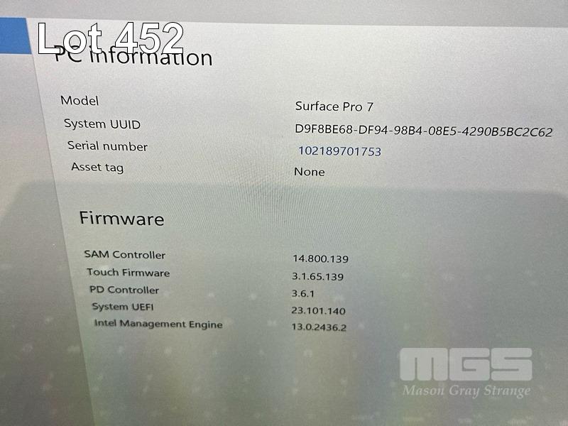 TABLET PC, MICROSOFT SURFACE PRO 7, MODEL 1866, CORE i5 1035G4 (10TH GEN) @ 1.1GHz, 8GB RAM, 256GB SSD, 12.3" TOUCHSCREEN (2736x1824), INTEL IRIS PLUS GRAPHICS, Wi-Fi, BLUETOOTH, WINDOWS 11 HOME INSTALLED & POWER SUPPLY S/N:102189701753