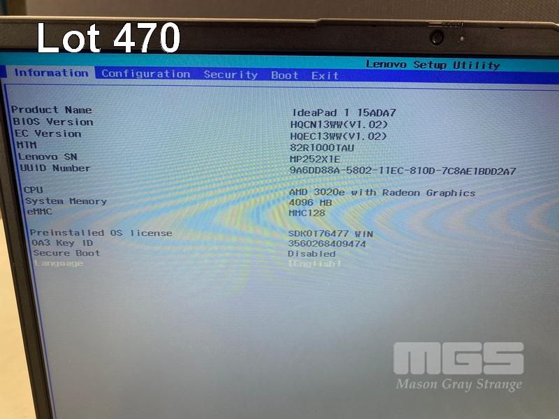LAPTOP, LENOVO IDEAPAD 1 15ADA7, AMD 3020e @ 1.2GHz, 4GB RAM, 128GB eMMC STORAGE, 15.6" WIDESCREEN (1366x768), Wi-Fi, BLUETOOTH, WINDOWS 11 HOME INSTALLED & POWER SUPPLY S/N:MP252X1E