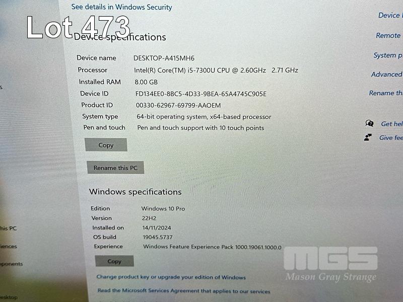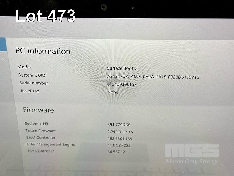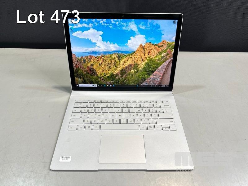 LAPTOP, MICROSOFT SURFACE BOOK 2, CORE i5 7300U (TH GEN) @ 2.6GHz, 8GB RAM, 128GB SSD, 13.5" TOUCHSCREEN (3000x2000), INTEL HD GRPAHICS 620, Wi-Fi, BLUETOOTH, WINDOWS 10 PRO INSTALLED & POWER SUPPLY (NOTE: CRACK LINE CORNER OF SCREEN, MINOR DAMAGE TO CASING, DAMAGED "SHIFT" KEY) S/N:012159390157